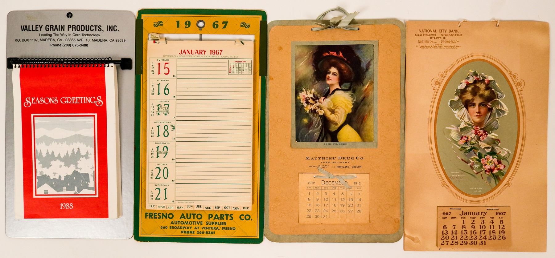 This is a collection of calendars with a tear-away month. The earliest is 1907 with all months intact. The latest is 1988 with a flip date by page.Four pieces in all.