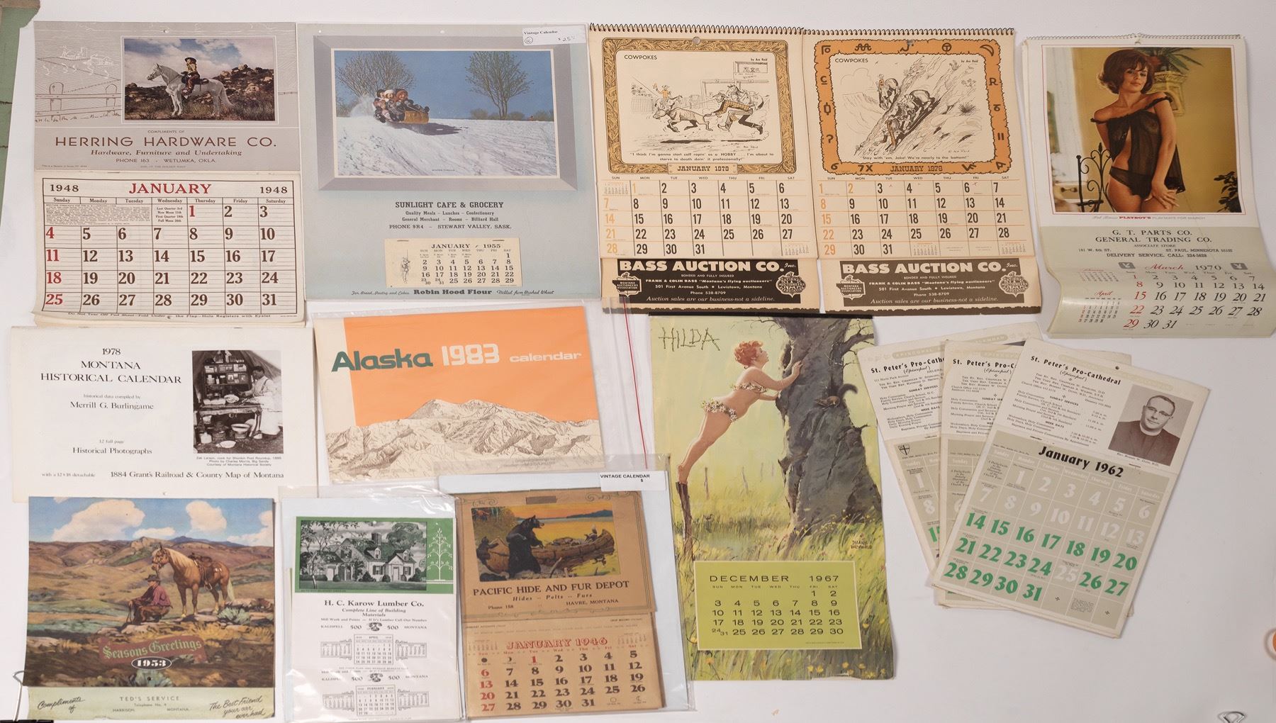 lot 0f 36. A Variety Collection. Examples : 1970 Playboy calendar in very good condition, St. Peter's Pro-Cathedral church (1962,63,67), 1978 Montana Historical Calendar w/great B/W photos and a State Map (very good condition), 1983 Alaska calendar w/drawings by Steve Hillyer (new condition, Two Bass Auction Co Montana w/drawings by Western "Cowpoke" Artist Ace Reid (Near new cond). 1940 Southern Pacific RR for Oct, Nov, Dec ( the largest of collection 14X22"). State: City: Date:1909-78 Provenance: Stuart Mackenzie Montana Ephemera Collection