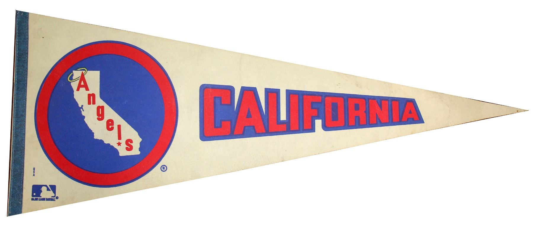 This listing is for a vintage California Angels Baseball Pennant, measures 30 inches long, 11.25 inches tall. This piece has some small pinholes, and some light discoloration/wear. Few bends aw well. Wonderful piece for any Angles collector pre-2000 items.