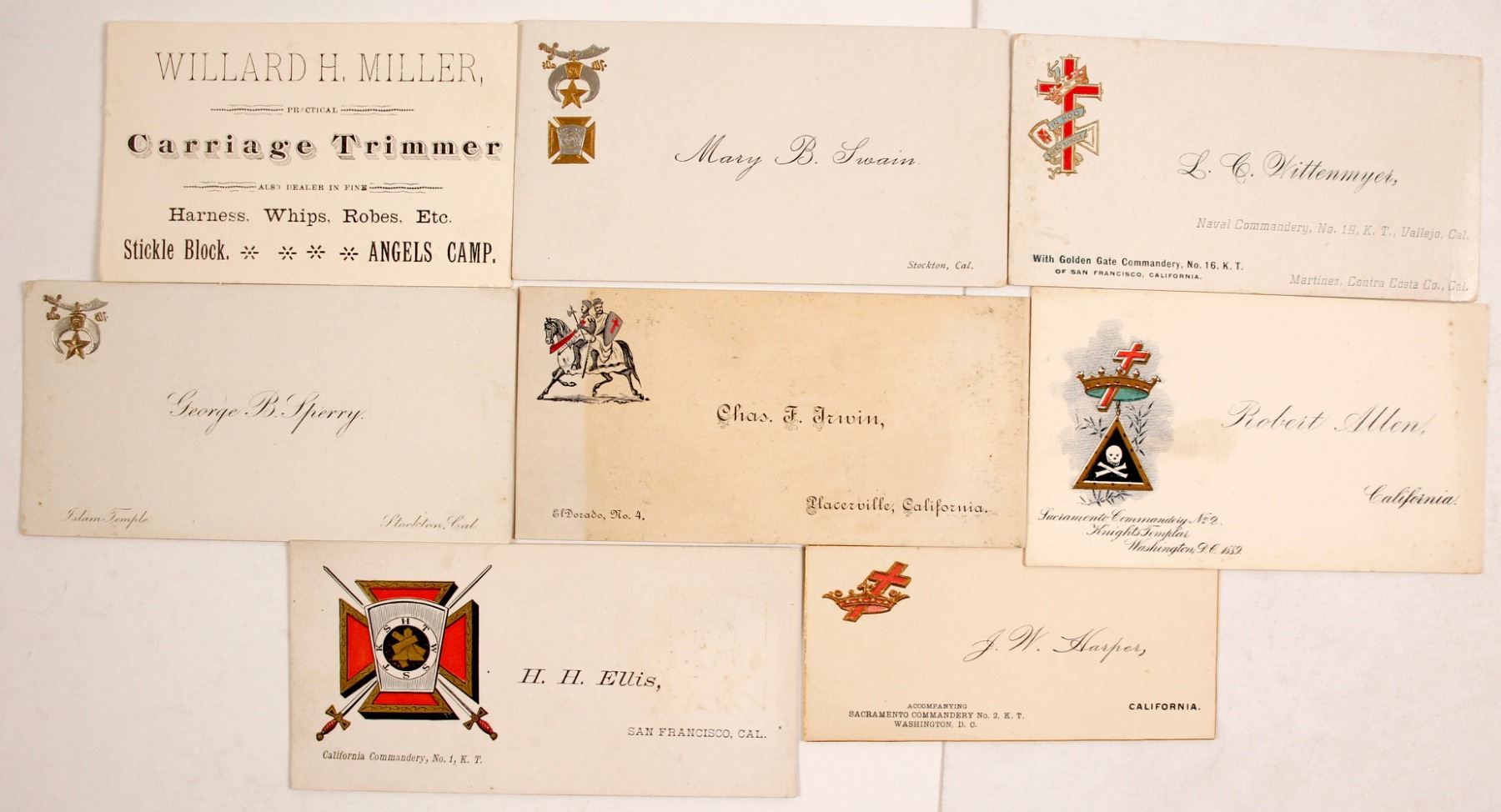Lot of 8. Seven are fraternal calling cards for California members of the Knights Templar in Sacramento, Placerville, Stockton, Vallejo, and San Francisco. The last piece is a 19th century business card for Willard H. Miller, Carriage Trimmer in Angels Camp.