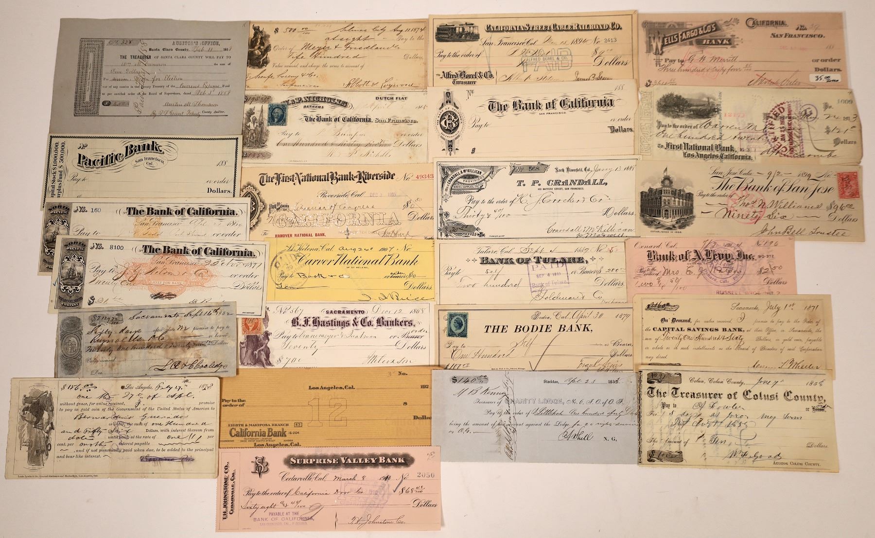 Wonderful assortment of over 20 checks dating back to 1852 from various California cities. Santa Clara, San Francisco, Cedarville, Sacramento, Colusi County, Los Angeles, Bodie, San Jose, Tulare, Riverside, St. Helena, Oxnard, Salinas. Includes a Sutro autograph.