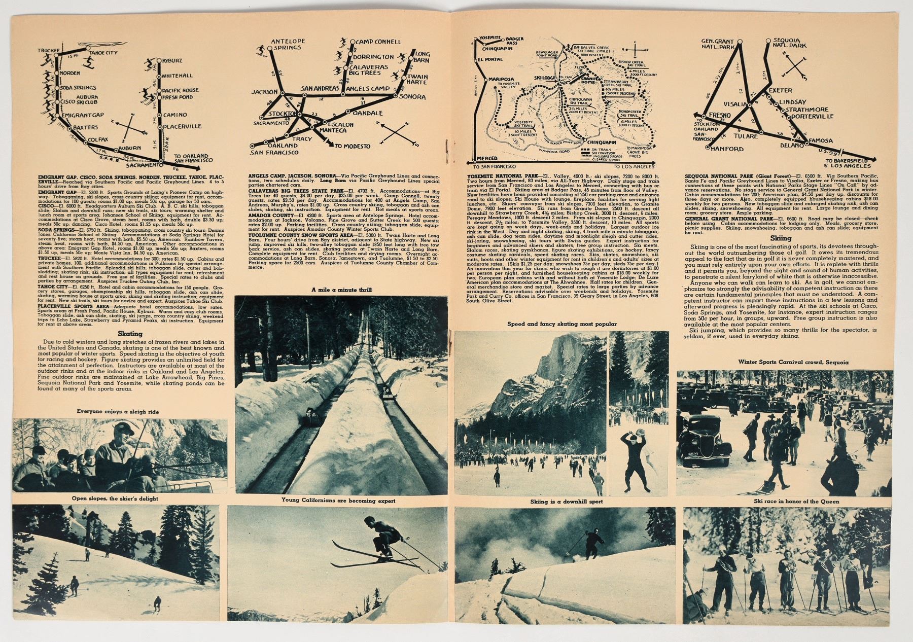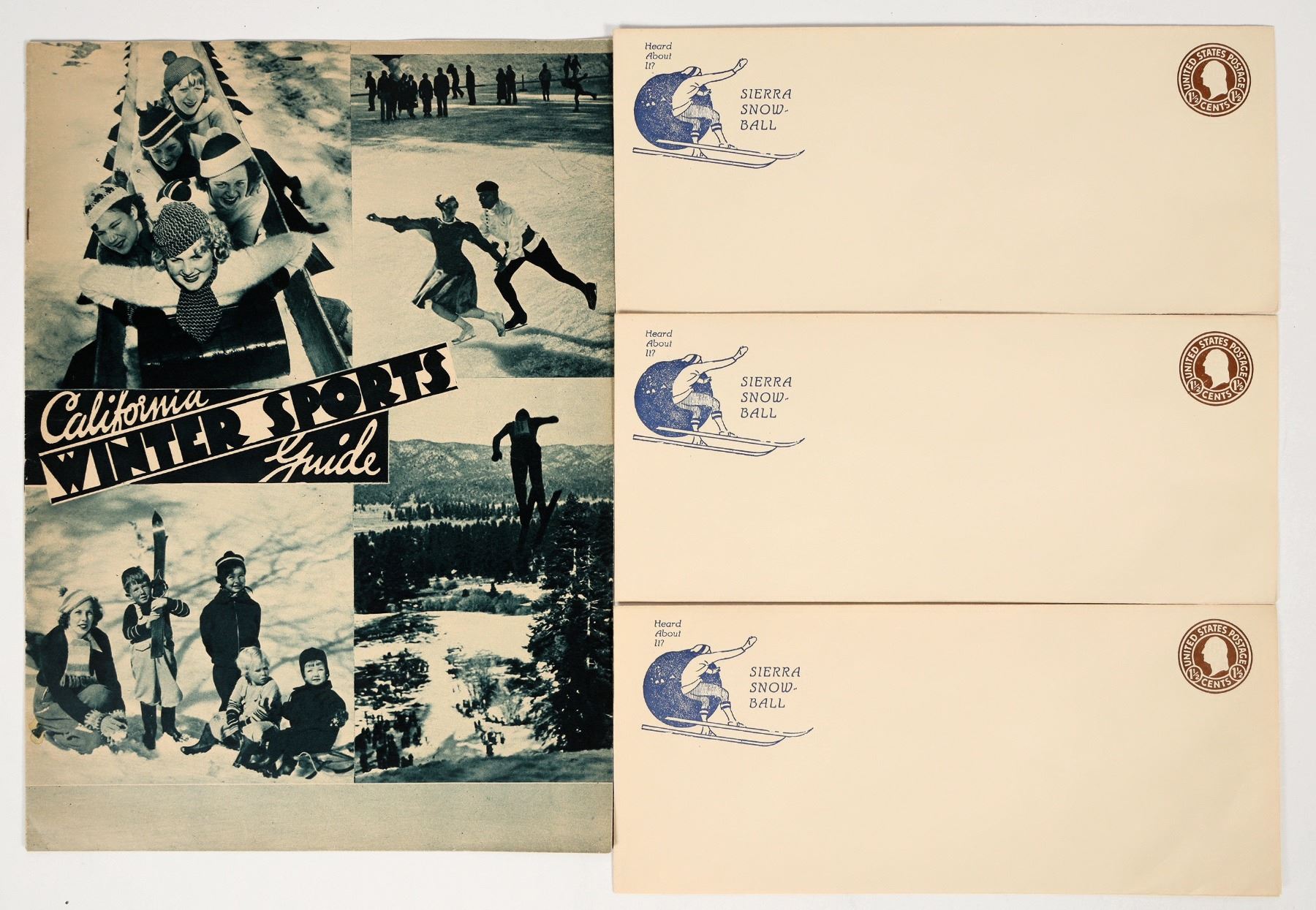 Group of vintage skiing ephemera from California. Lot includes the California Winter Sports Guide (c. 1940s-1950s), which is full of photos, events, and advice for tourists; also included are 3 unused pictorial prepaid envelopes with the image of a skier. See photos.