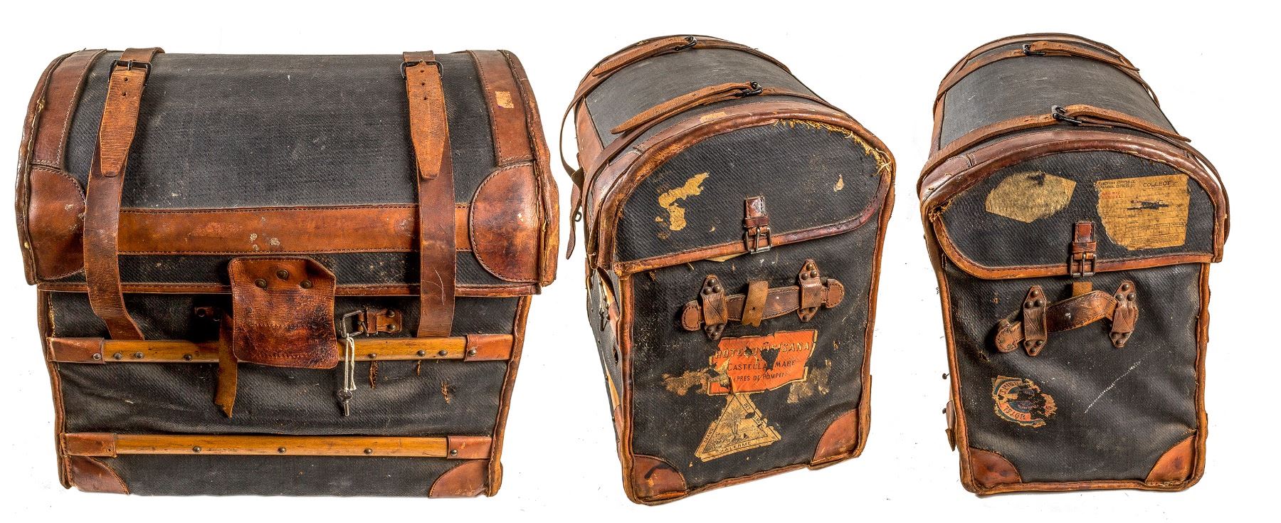 Vintage camelback passenger trunk for ocean liner travel. Various labels: Hotel Quisisiana, Castellammare (Pres De Pompei); Grand Hotel des Palmes, Palerme; American Express Collect label. Great old trunk, wicker inside with nice linen liner. Leather edging and straps. Date: Location: HWAC# 41920
