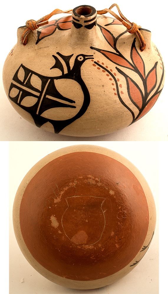 Canteen by Arthur and Hilda Coriz. Arthur and Hilda Coriz were Native American husband and wife potters from Santo Domingo Pueblo. Canteen is 5" h x 7" diameter. Floral and bird design, in very good condition.