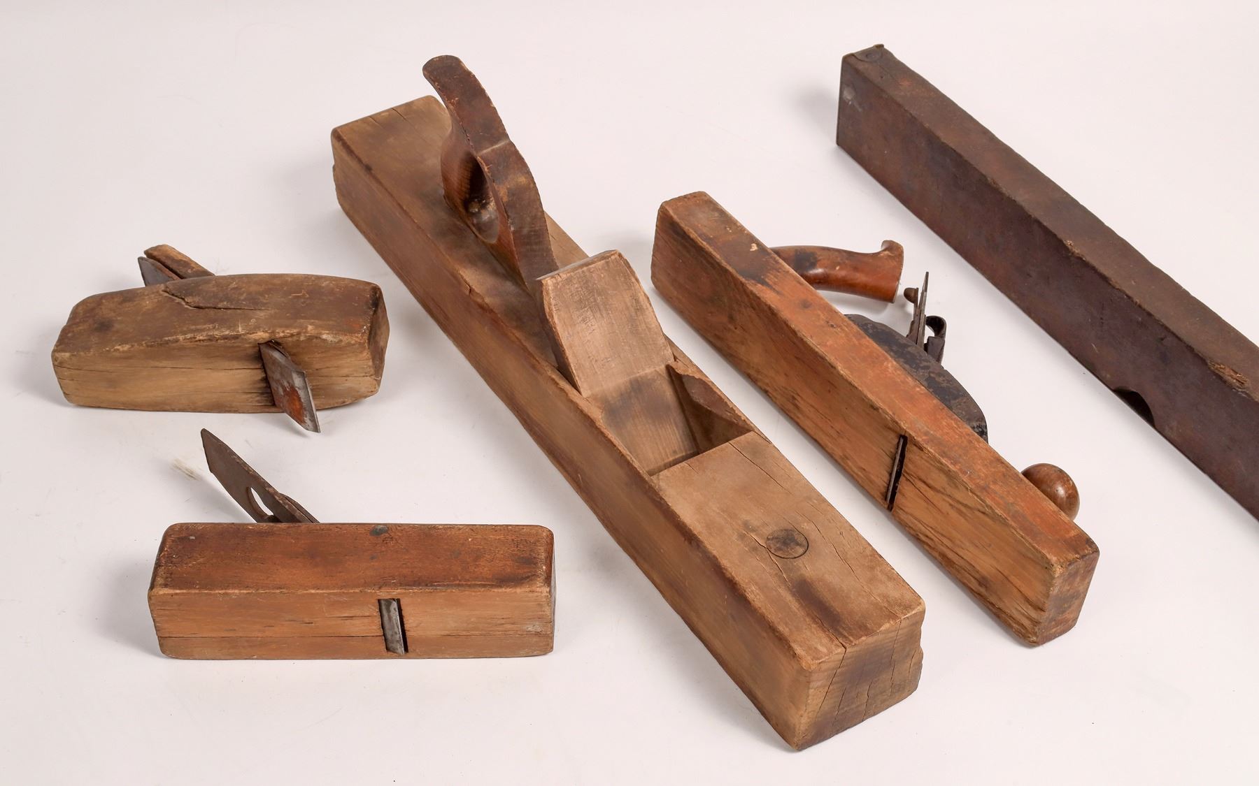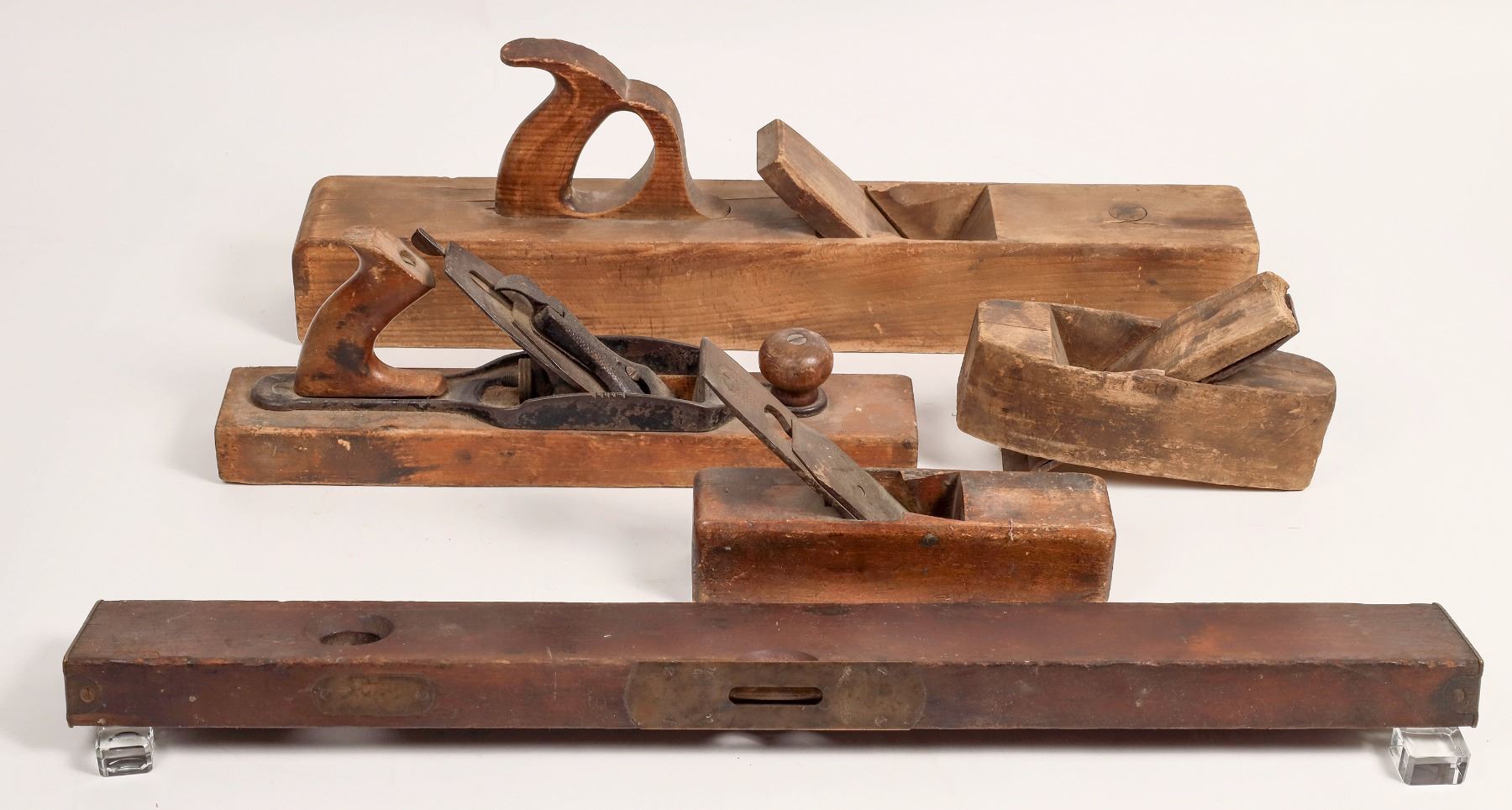 There is a Standard Eclipse level marked 30 (inches) made by Baker & McMillen or Ohio; however it now measures 26 in. There are four wood planes 8", 8.5", 15", 22"; all are unmarked and handmade. This carpenter made his own planer tools. c1900