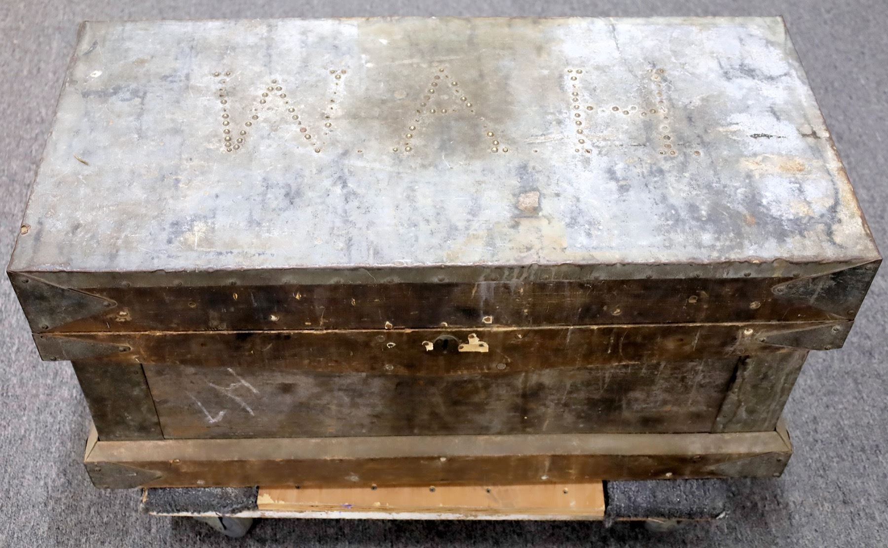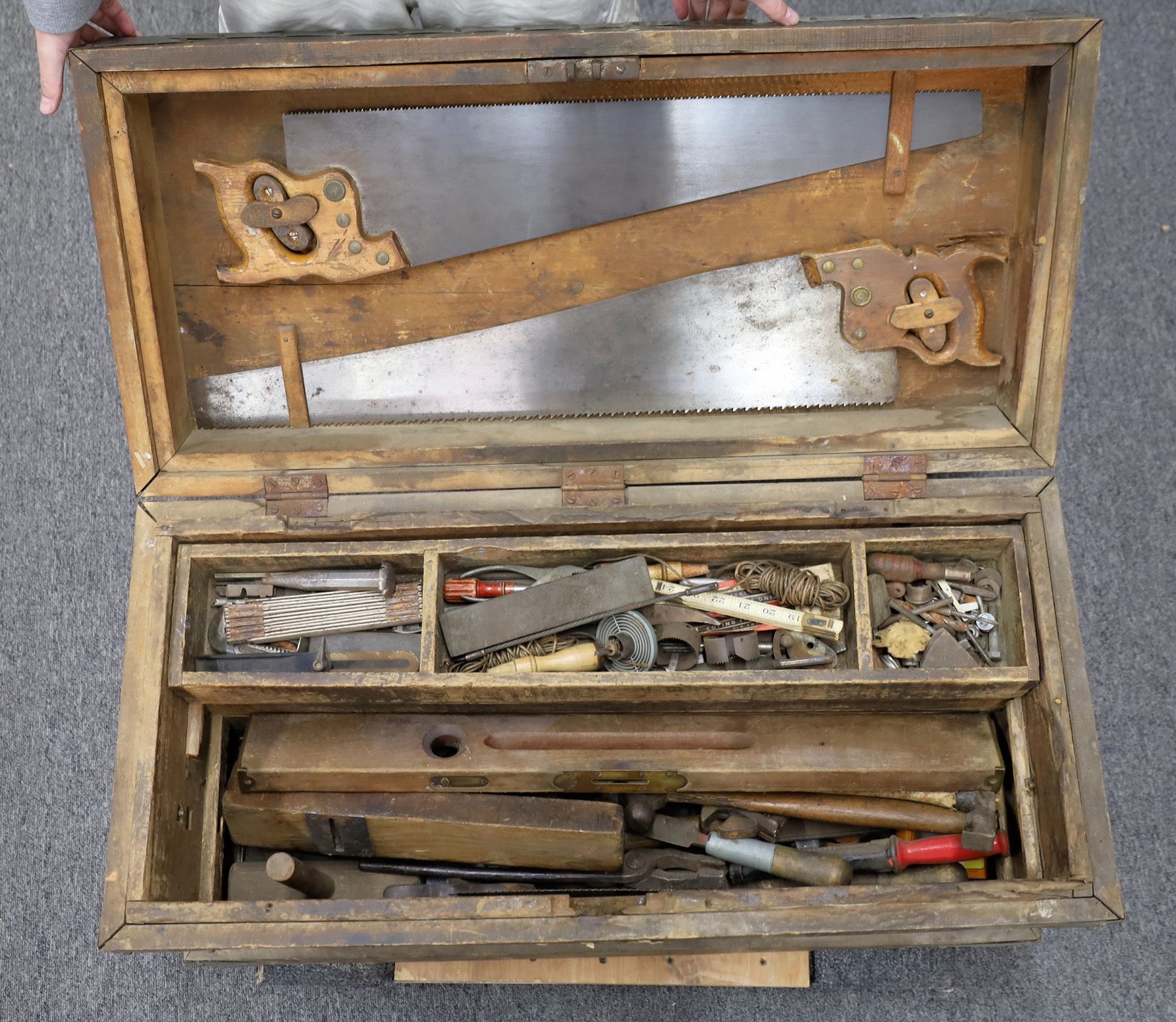 Older tool chest 36"x 16"x 12" containing several vintage carpentry tools, including crosscut hand saws, hammers and measuring sticks. Box has leather handles which could use replacing. This is indeed a relic from the past, but still could prove useful. Please see photos for more detail or condition.