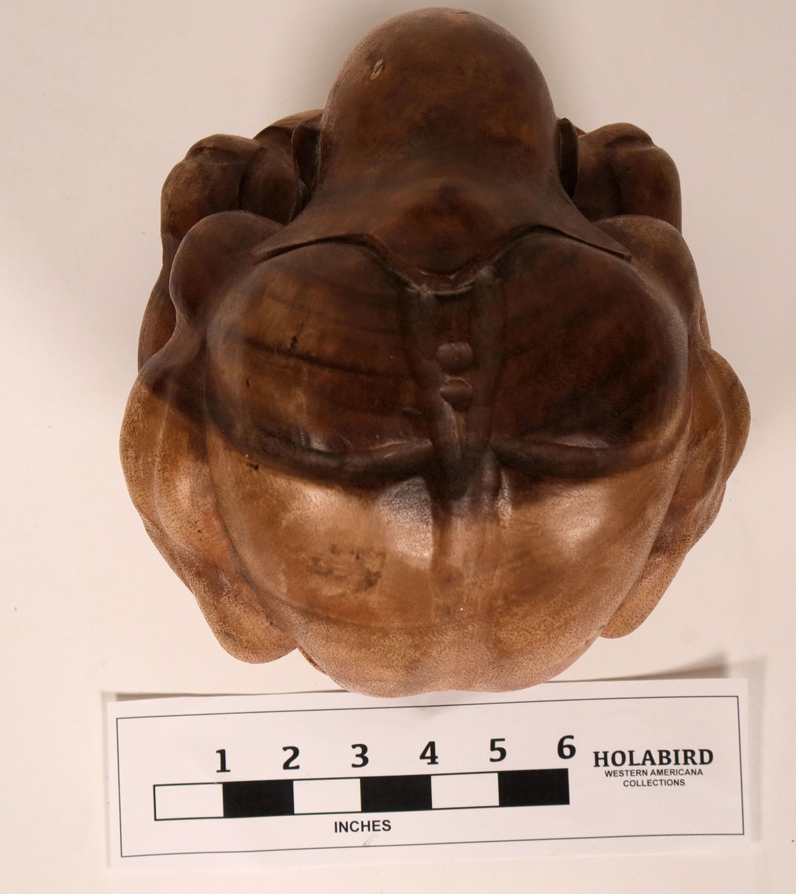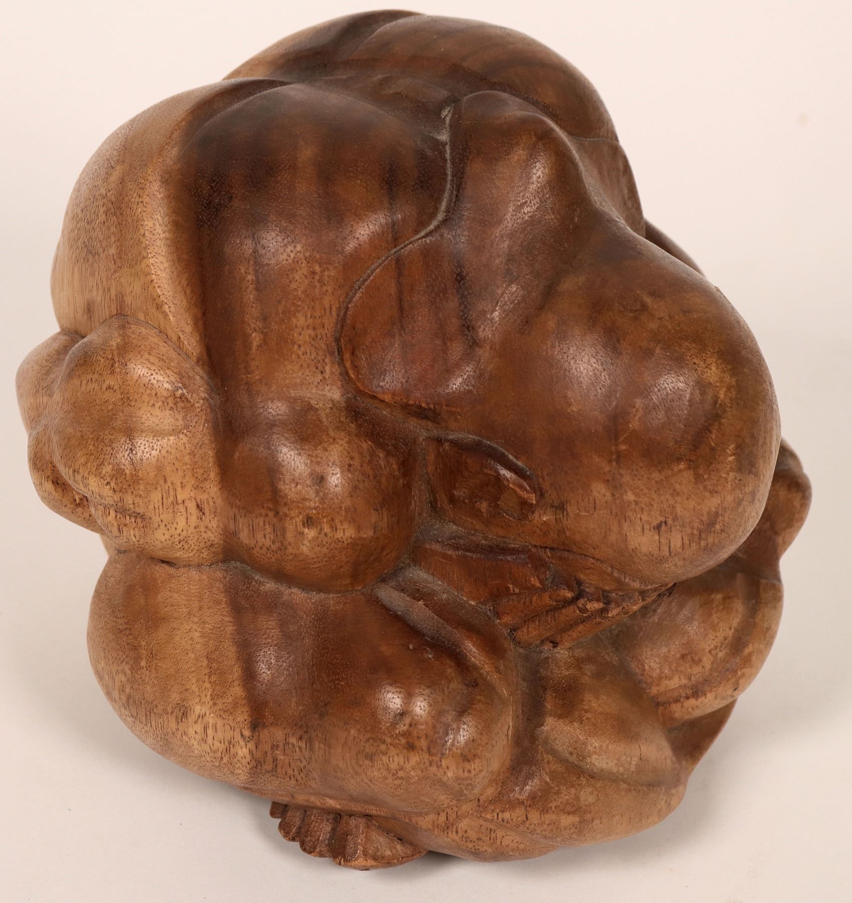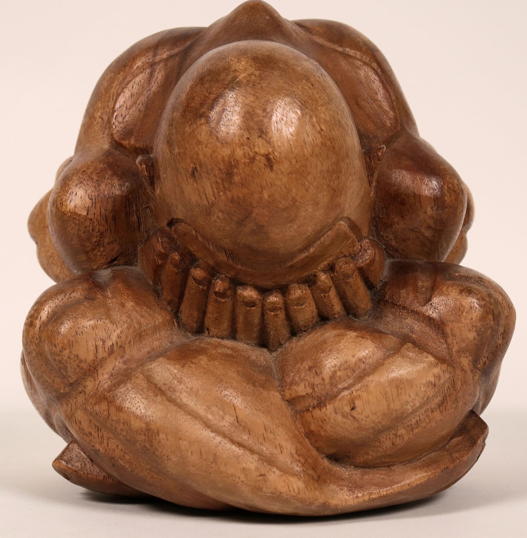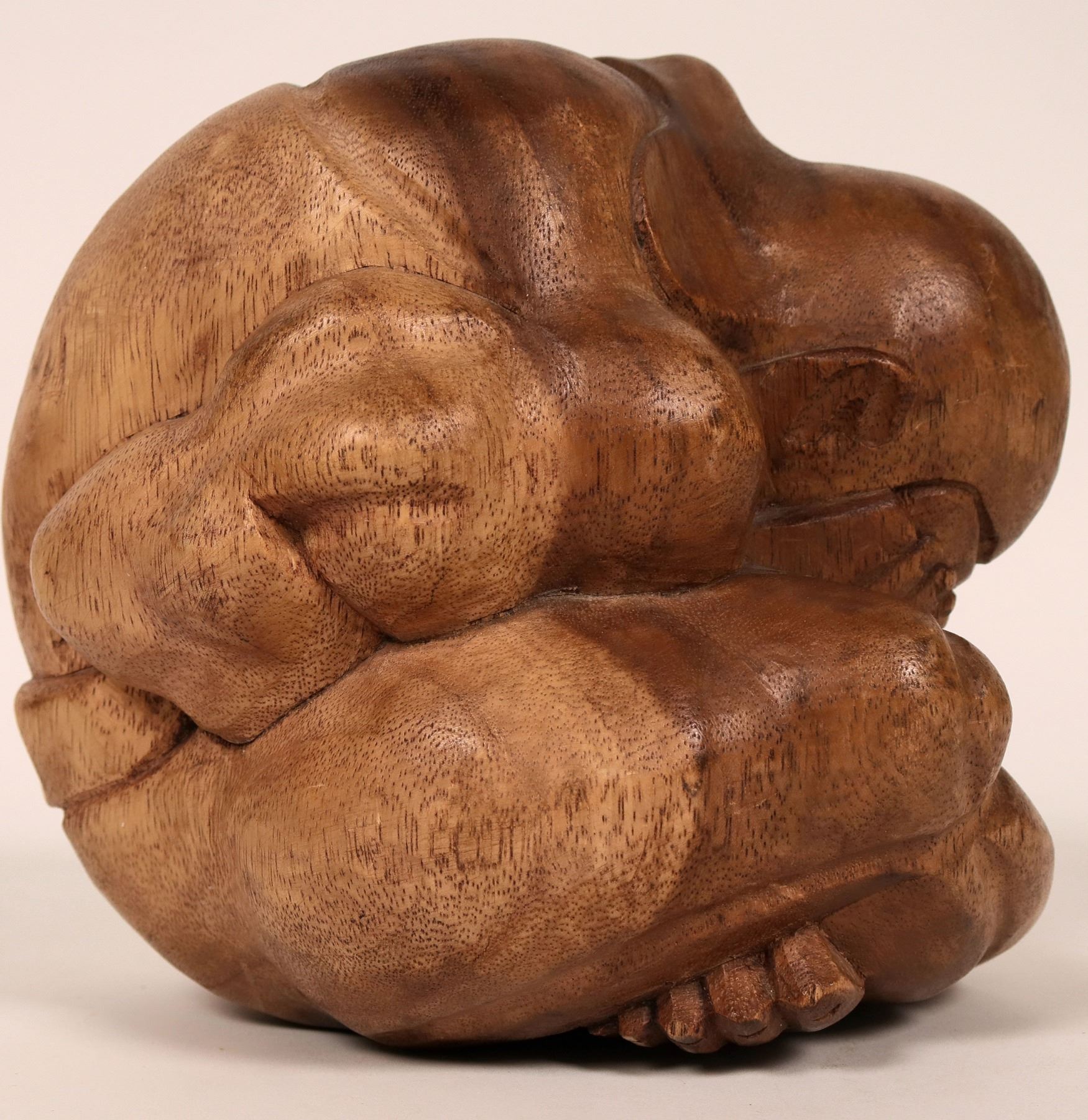 Beautifully and elegantly hand carved Japanese Sumo wrestler of teak wood. He wears the traditional Japanese “fundoshi” garment worn by sumo wrestlers. He appears to a strong man physically. However, he sits cross legged holding his head in his hands, an emotional pose. 7.5" x 7" x 9", carved from a single piece of teak.