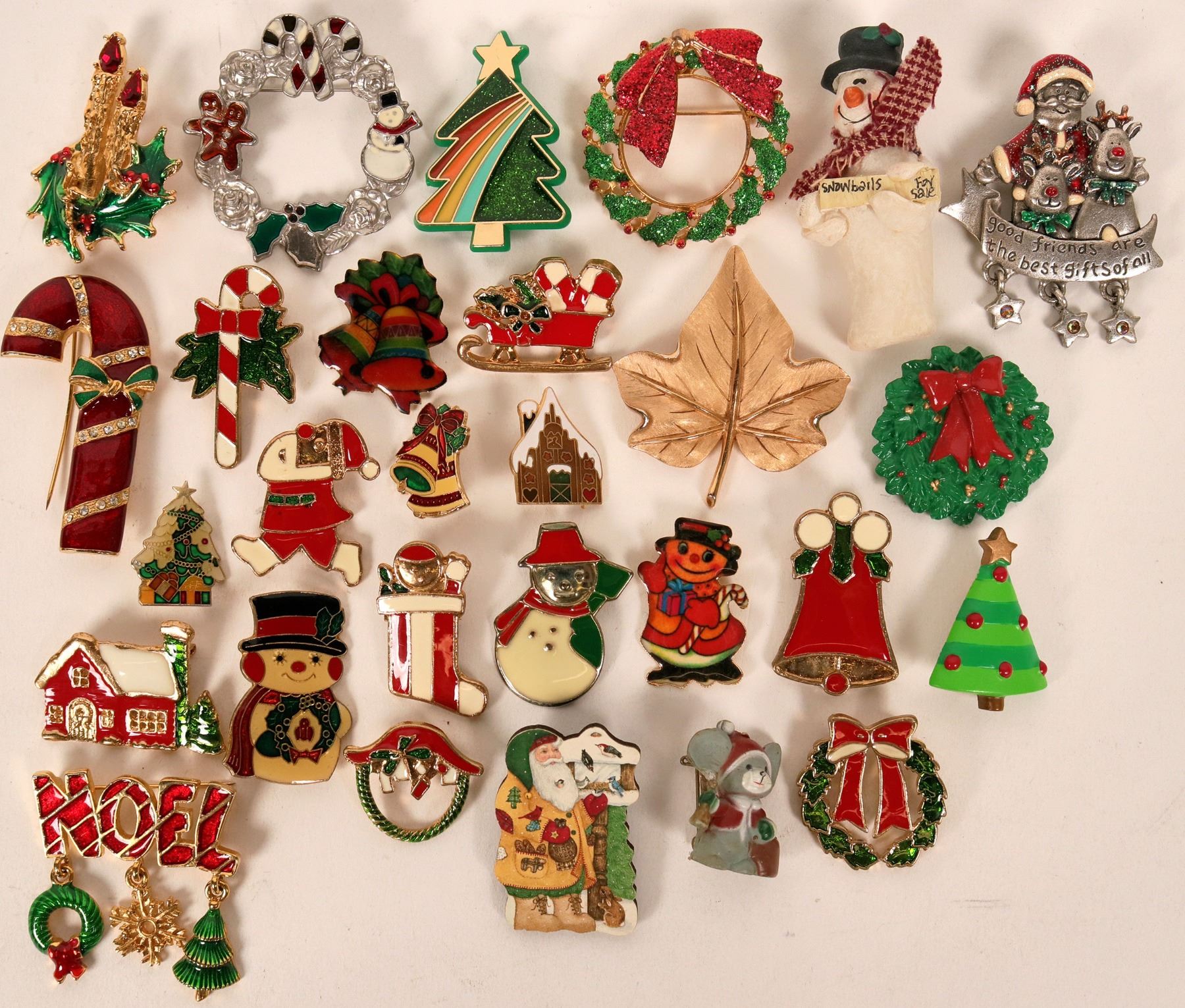 An assortment about 28 of Christmas lapel pins and brochures that include, Christmas trees, Snow Men, Wreaths, Santas, Sleighs. Refer to photo.