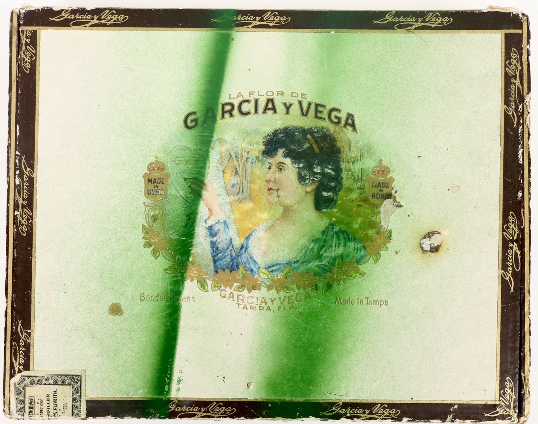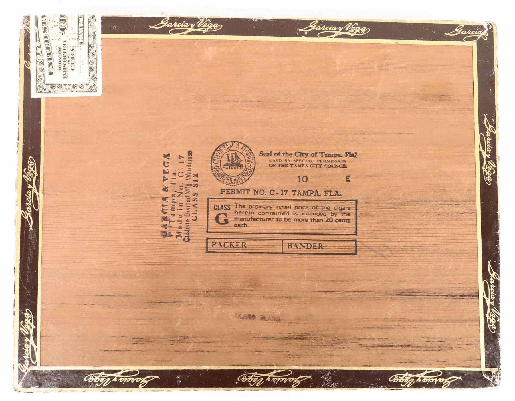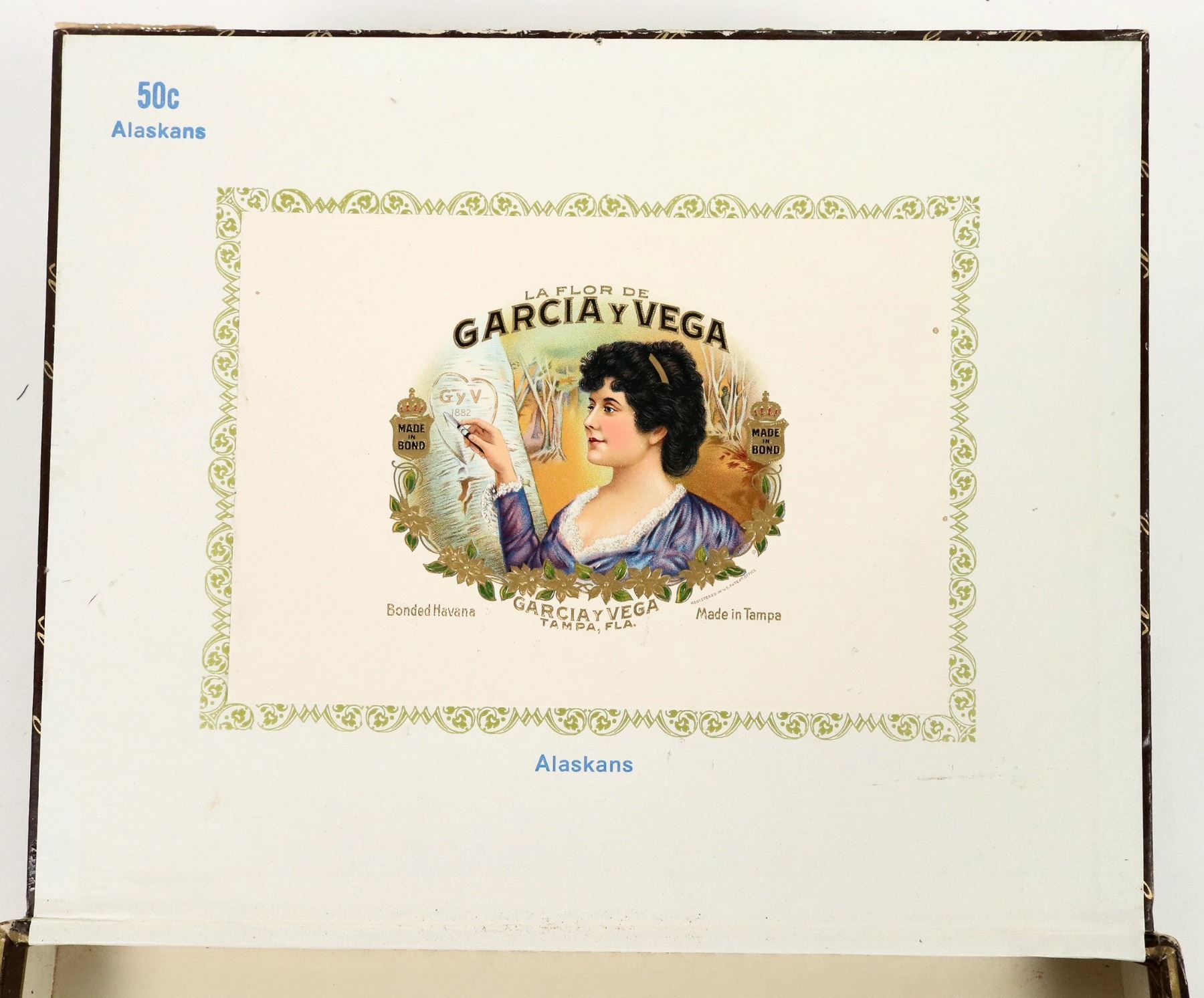 Vintage Garcia y Vega Cigar Box, named "Alaskans." We have never seen cigars labeled as such! Box measures 10.5" x 8.25" x 1.25". Cedar wood band surround, cedar bottom panel. Top panel has what appears to be paint overspray across the middle.