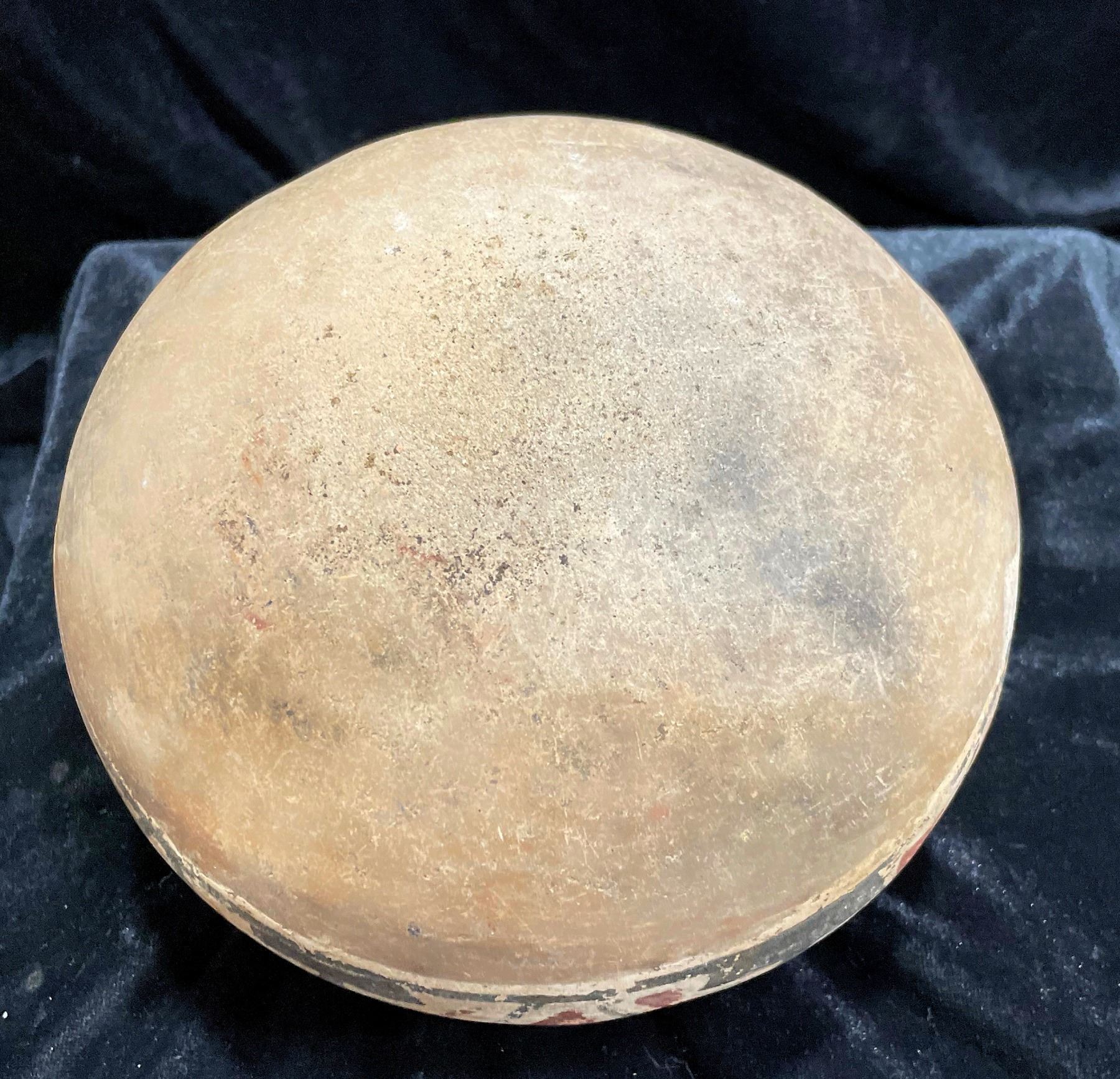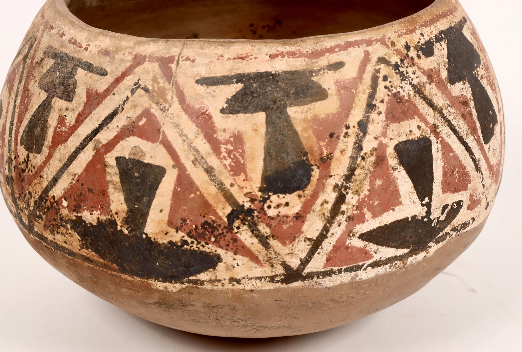 Very old Cochiti or Santo Domingo red ware bowl with black, white and red geometric design. Round bottom with signs of use. 4"x7". 1.5". Crack from rim downward, please inspect.