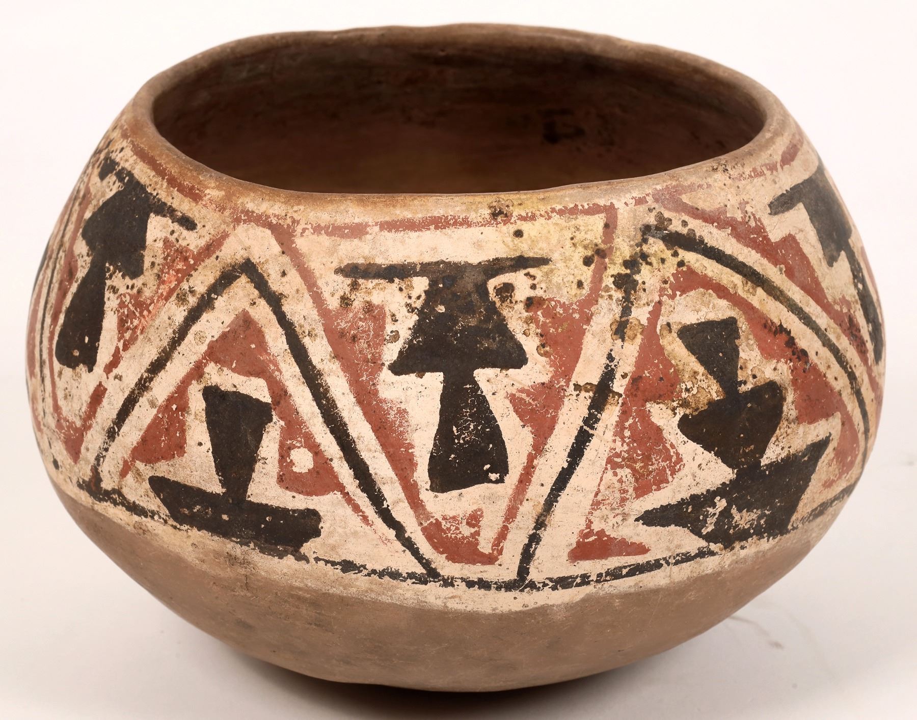 Very old Cochiti or Santo Domingo red ware bowl with black, white and red geometric design. Round bottom with signs of use. 4"x7". 1.5". Crack from rim downward, please inspect. New Mexico