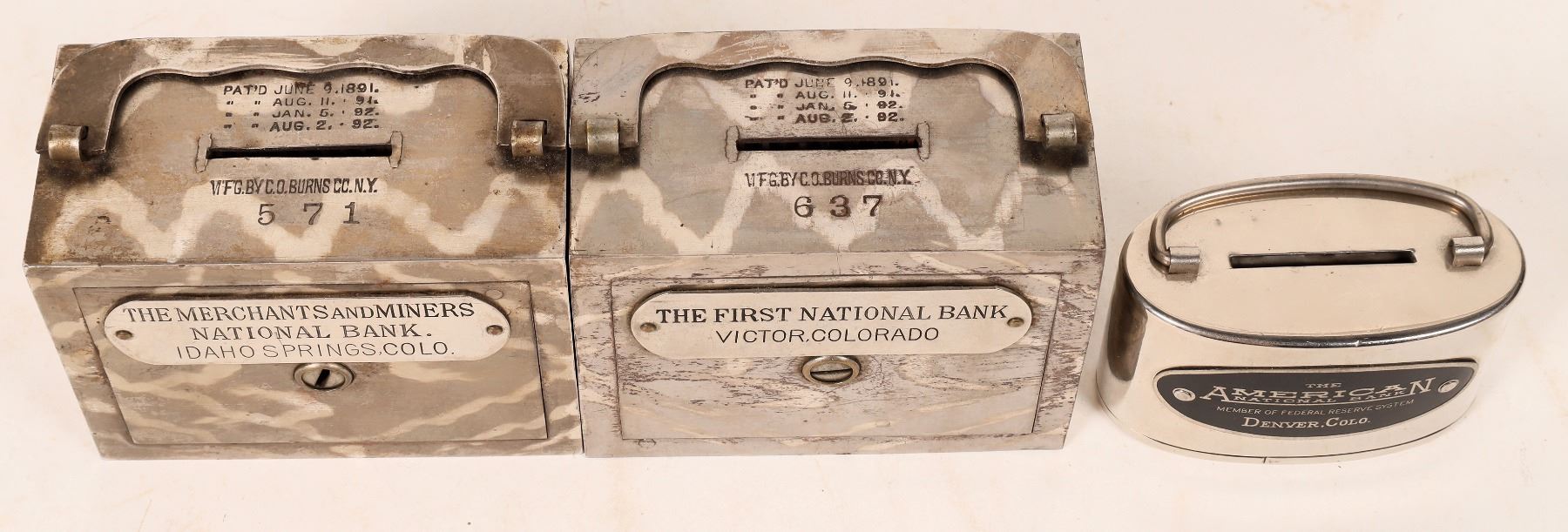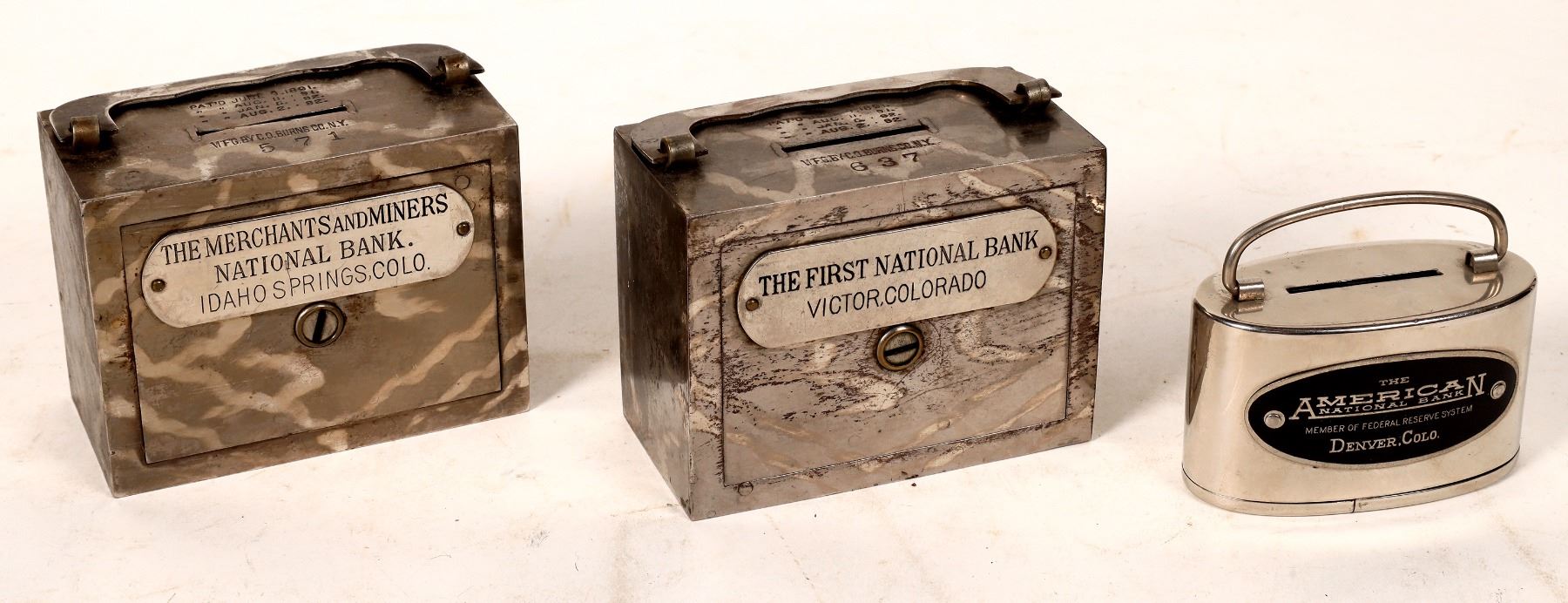 Lot of three vintage coin banks from Colorado: 1) The First National Bank, Victor, Colorado, patent 1891 (4 1/2 x 3 1/2 x 2 1/2 inches, with handle. 2) The Merchants and Miners National Bank, Idaho Springs, Colo. (same size as the first). 3) The American National Bank Member of Federal Reserve System, Denver, Colo. (oval, 3 1/2 x 2 x 2 inches). Colorado