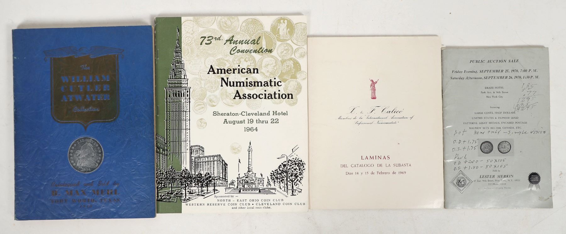 Lot of 4 different. Includes: Lester Merkin 1970 sale of large cents, half dollars, US & pioneer gold patterns, assay medals, enclosed postage Maundy sets, etc.; 75th Annual Convention ANA, 1964, catalog; William Cutler Atwater US Gold, Silver & Copper Coin Collection, sold by B. Max Mehl, 1946; and Laminas, Del Catalogo de la Subasta, 1969.