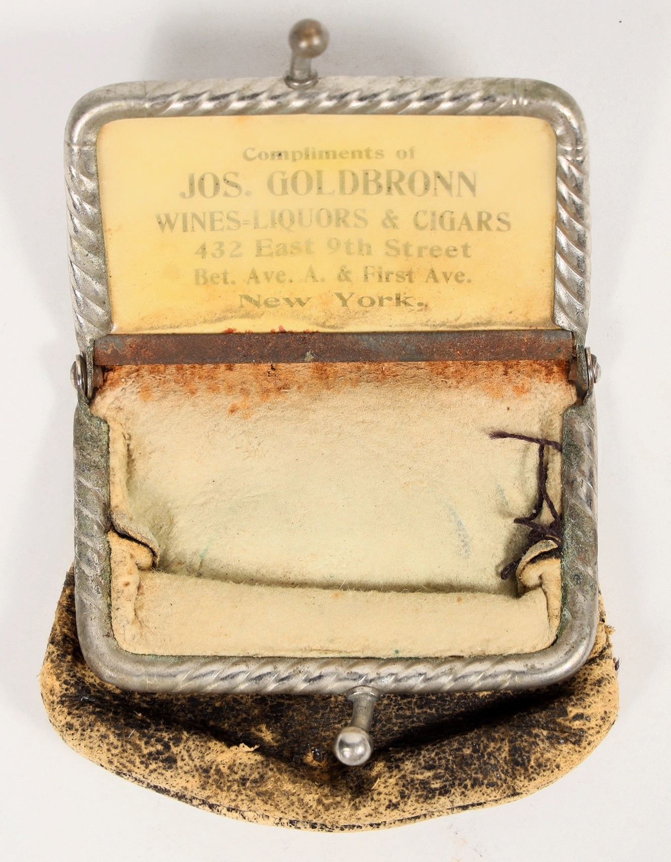 Compliments of Jos. Goldbronn, Wines- Liquors & Cigars 432 East 9th Street between Ave. A. & First Ave. New York. 2 1/2 x 2 inches, metal cover with Minerva's head. Elegant.