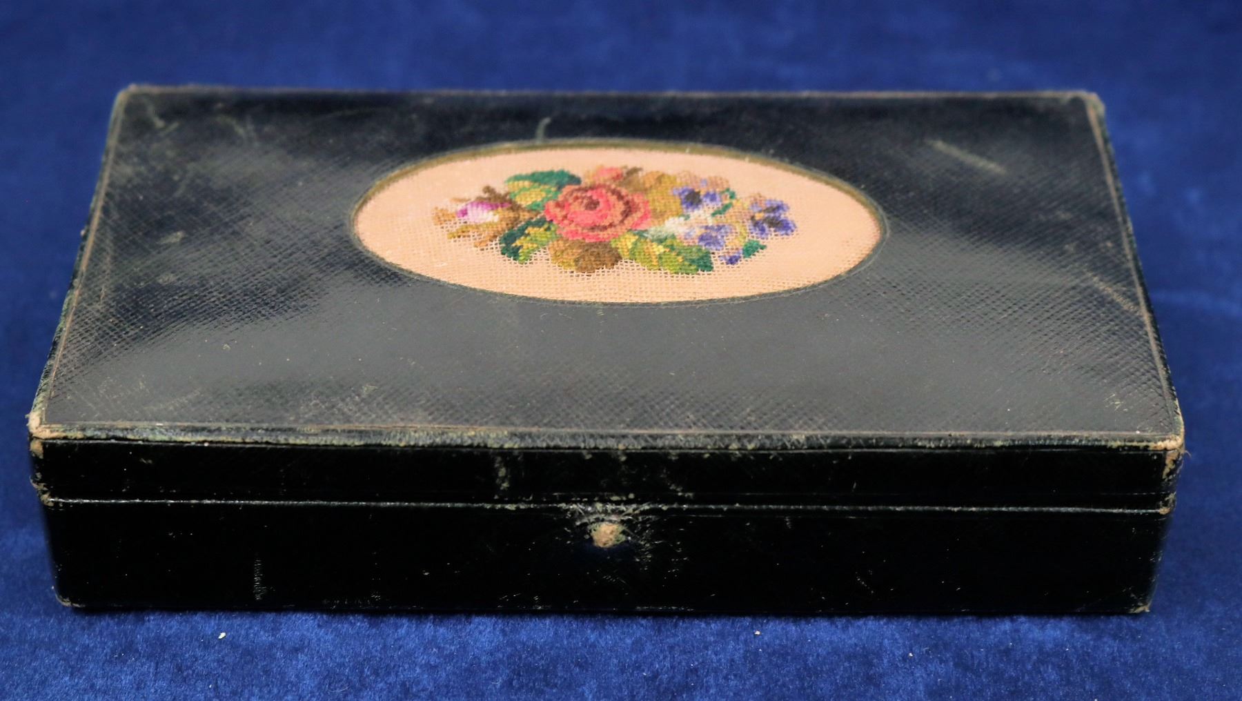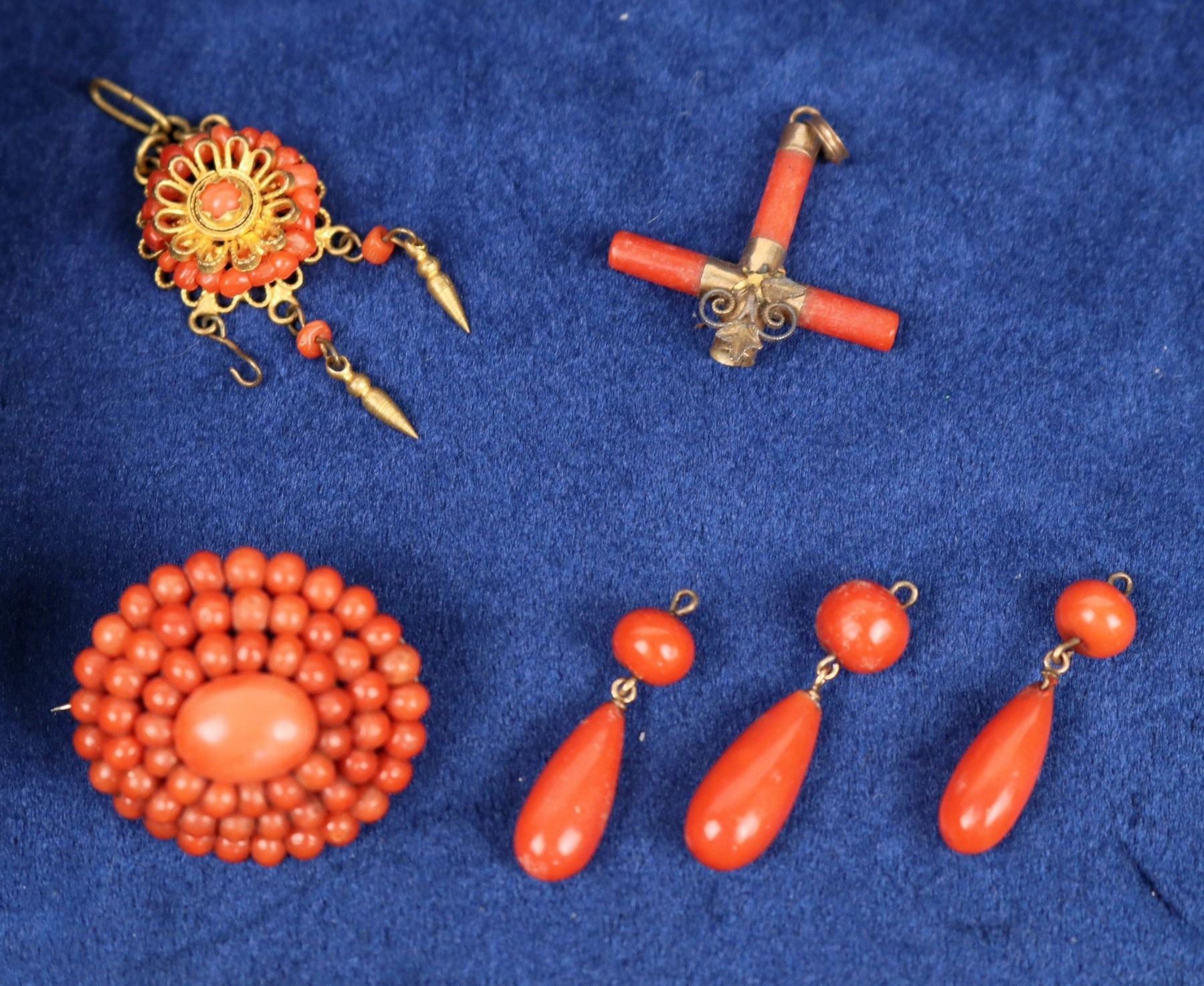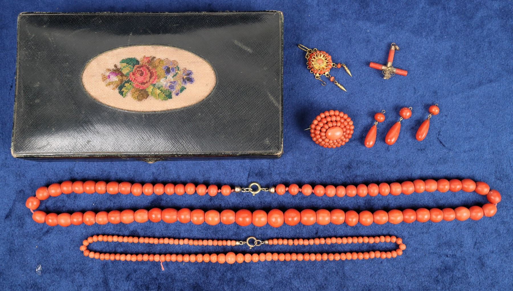 Antique graduated coral beaded necklace, 24". Smaller coral bead necklace, 15" long. Raised coral beaded brooch, large center stone, 1" x .75". Loose coral beads, possibly earrings. All in a black leather box with inset embridered center oval. Please inspect.