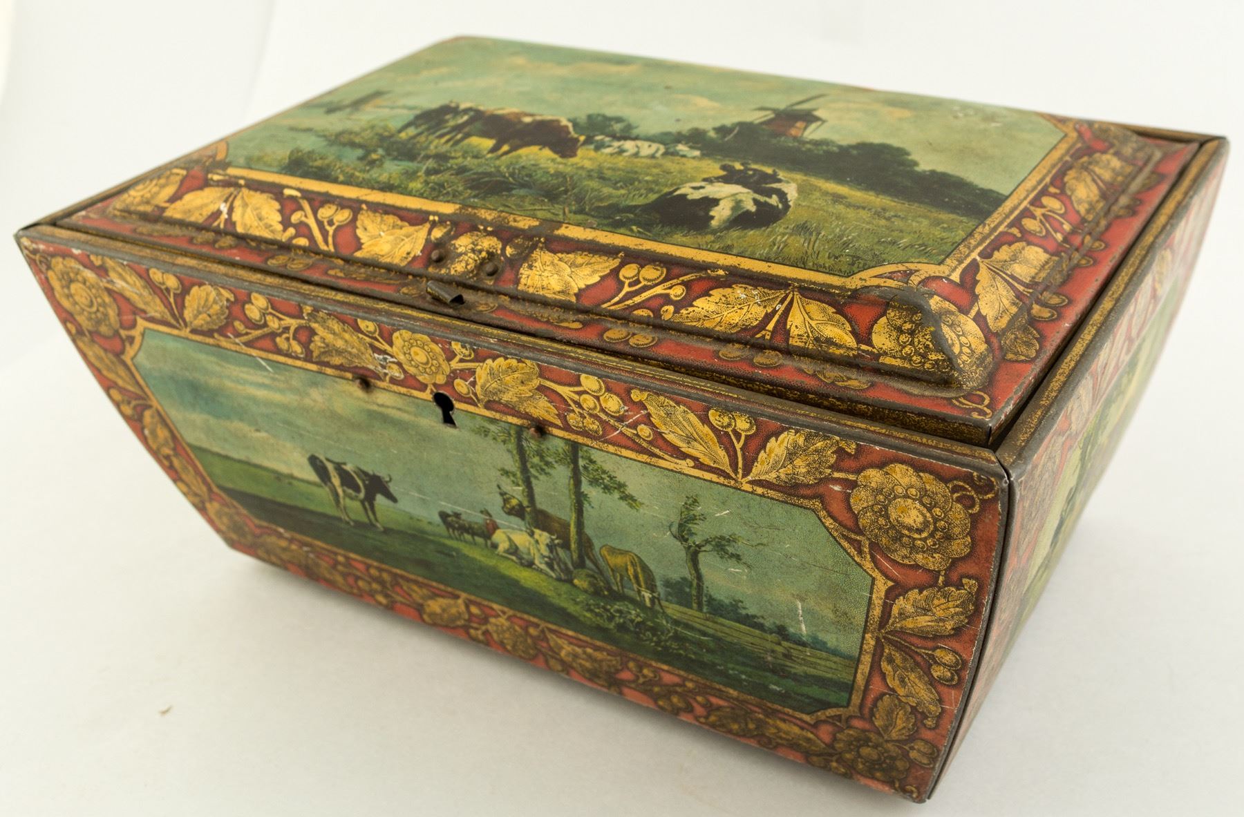 Vintage Cow Tin, approx 8.5, 5.5, 3.5 inches. Hinged top with a small internal lock, no key. State: City: HWAC#: 48304 Date: