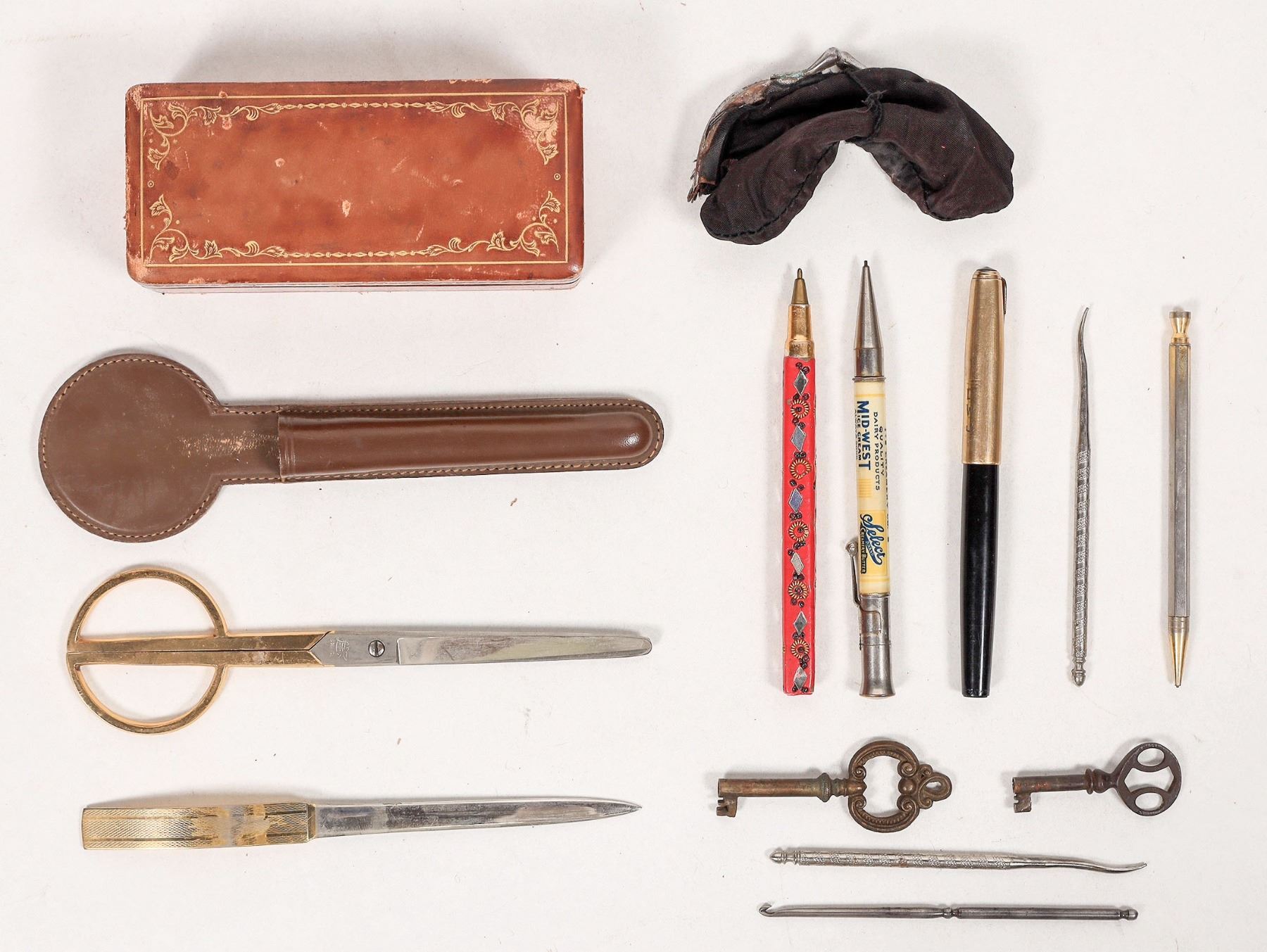 A vintage desk & dental set, included are four dentals probes (?), a ballpoint pen, a mechanical pencil, two skeleton keys, a leather stamp box and a letter opener/scissor set. Please see photos for more details.