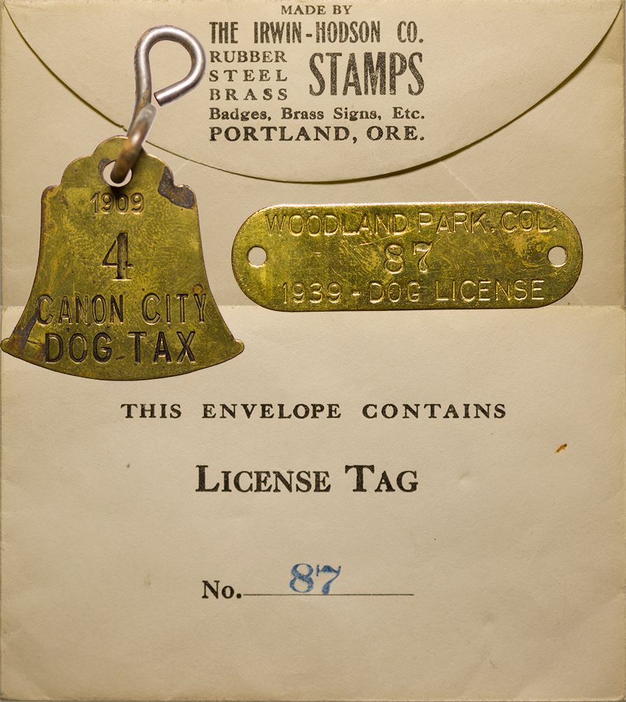 Two Colorado dog tags: 1909 Canon City bell shaped numbered 4, 1939 Woodland Park dog license number 87, brass, rectangular.