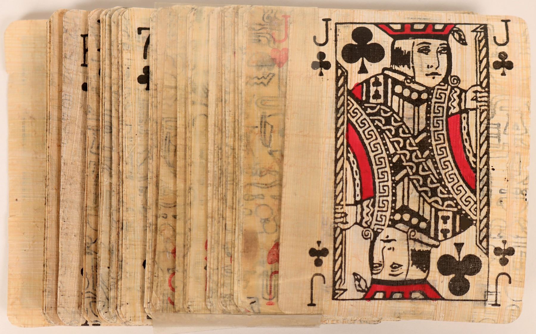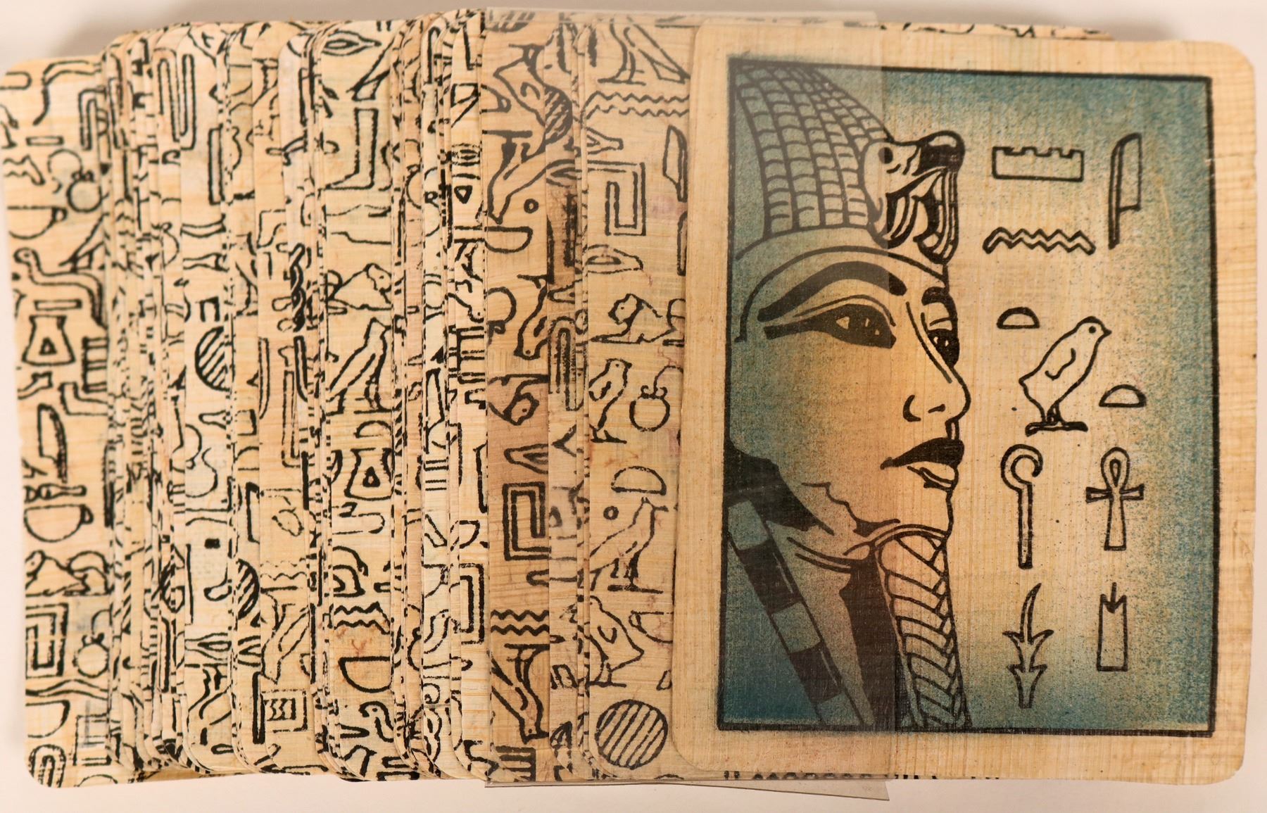 Vintage Egyptian Papyrus playing cards feature hieroglyphics on a papyrus background. Appears to be a full deck. Packaged with colorful cover card. Delicate. See photo for details.
