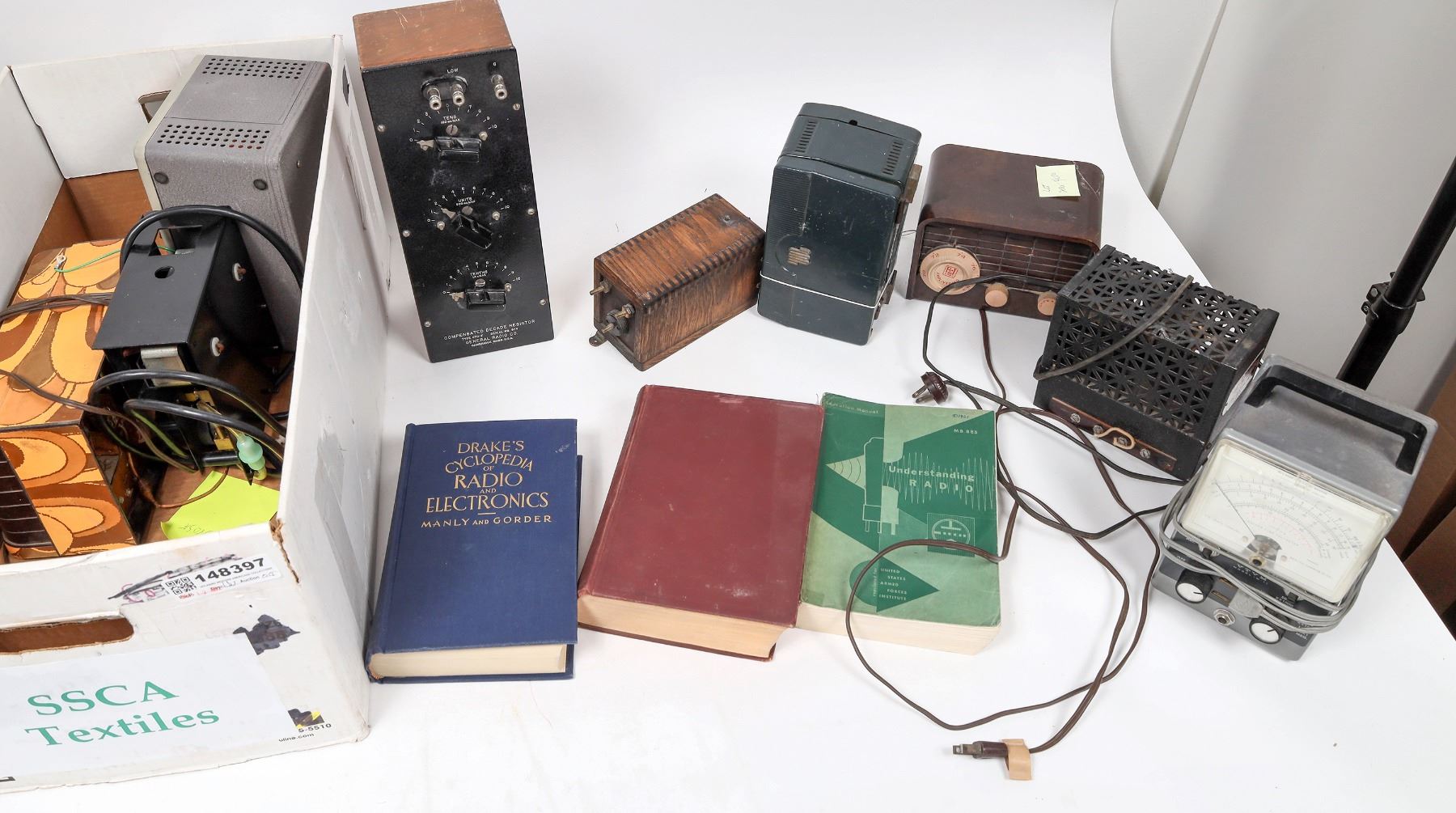 Lot of 11. 1. Heathkit: VTCM MOB IM-11 tested works. R.F. Signal generator, power cord cut, not tested. No outer damage. 2. Motorola Porter Model 52m1u, vacuum tube( tubes lit, shows life) radio. Broken hinge on antennae , knob missing. 3. General Radio Compensated Resister El-1769, a670 E 4. Telechron Musalarm Am radio -tested tubes lit, clock works. 4. Mystery component of the month. Appears to be some sort of pump, maybe for diabetics. Let us know. In new condition. 5. BJ Labs, Blonde-Tongue UHF converter . 6. G.T.C. Porta Power for 6V radios, tested works. Ex. cond. 7. K-W ignition magneto, missing some parts, cor 1910. 8. Three books : Drakes Encycla. of Radio and Electronics, Understanding Radio and Radio Physics Course.