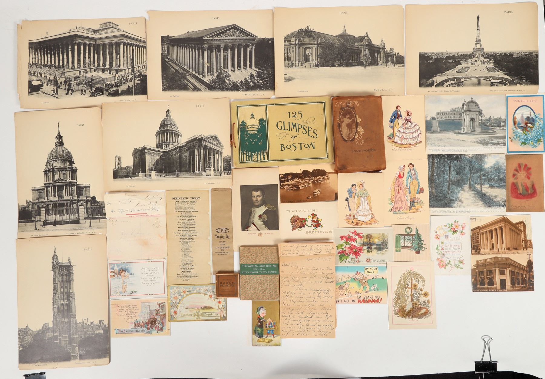 This large group varies from France to Massachusetts to California, and points between. Very diverse lot, it contains documents, post cards (foreign & domestic), photo booklets of Boston and of Paris, a bound book of "Love Poems," and even a tiny box of Benaderet's Harem Beauties Ladies Petite Cigarettes. These are all intact, real tobacco (very tiny) cigarettes. There is a DuPont Tamping bag, 1 1/4" x 6". A French picture of Napolean, several period color French Post cards, seasonal post cards, a written letter from 1945, and a tiny children's booklet (illustrated) titled "The Old Woman and Her Pig." Th title mentions other wording, but not for printing here. This extremely diverse group warrants your review and study, too much to list here.