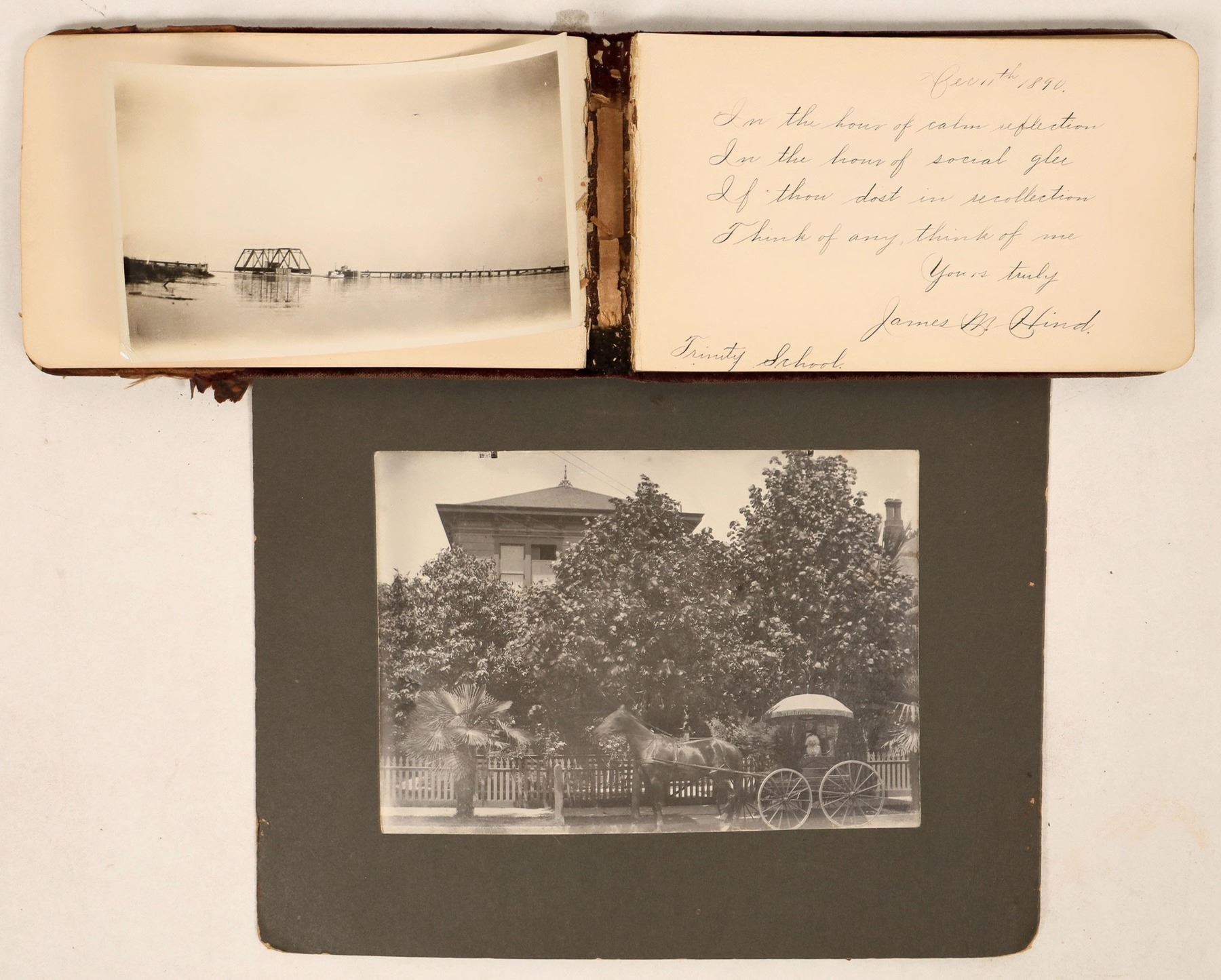 Lot of 3. One 8x10" framed photo of woman and dog in horse drawn buggy IFO 628 First St. Napa, Ca. 4x6" photo of Napa river draw bridge. One red velvet w/embossed leaf autograph book poems/salutations with signatures from 1890-92. Photos are in VG condition. Autograph book does show signs of it's age by a worn cover and the binding starting to separate.
