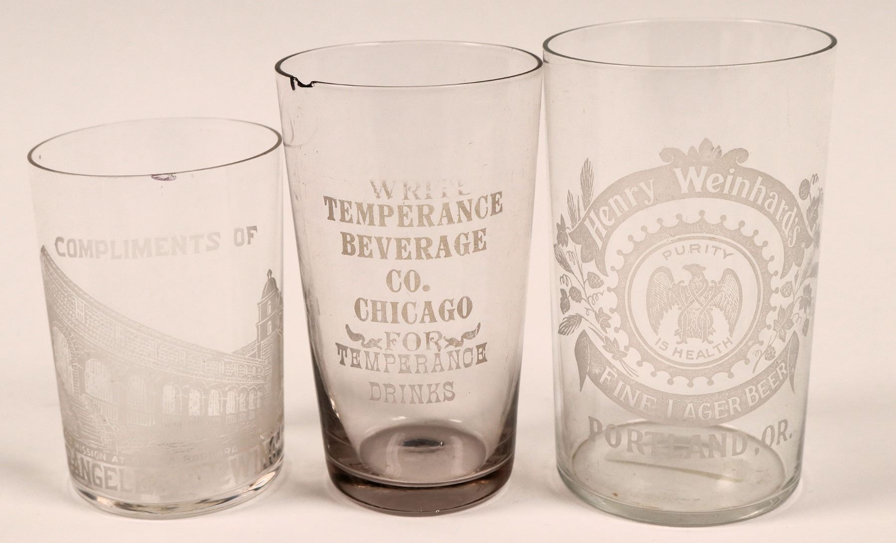 Los Angeles Brewing Co., Old Mission; Henry Weinhard's, Portland; Temperance Beverage glass (rare) chipped all etched.