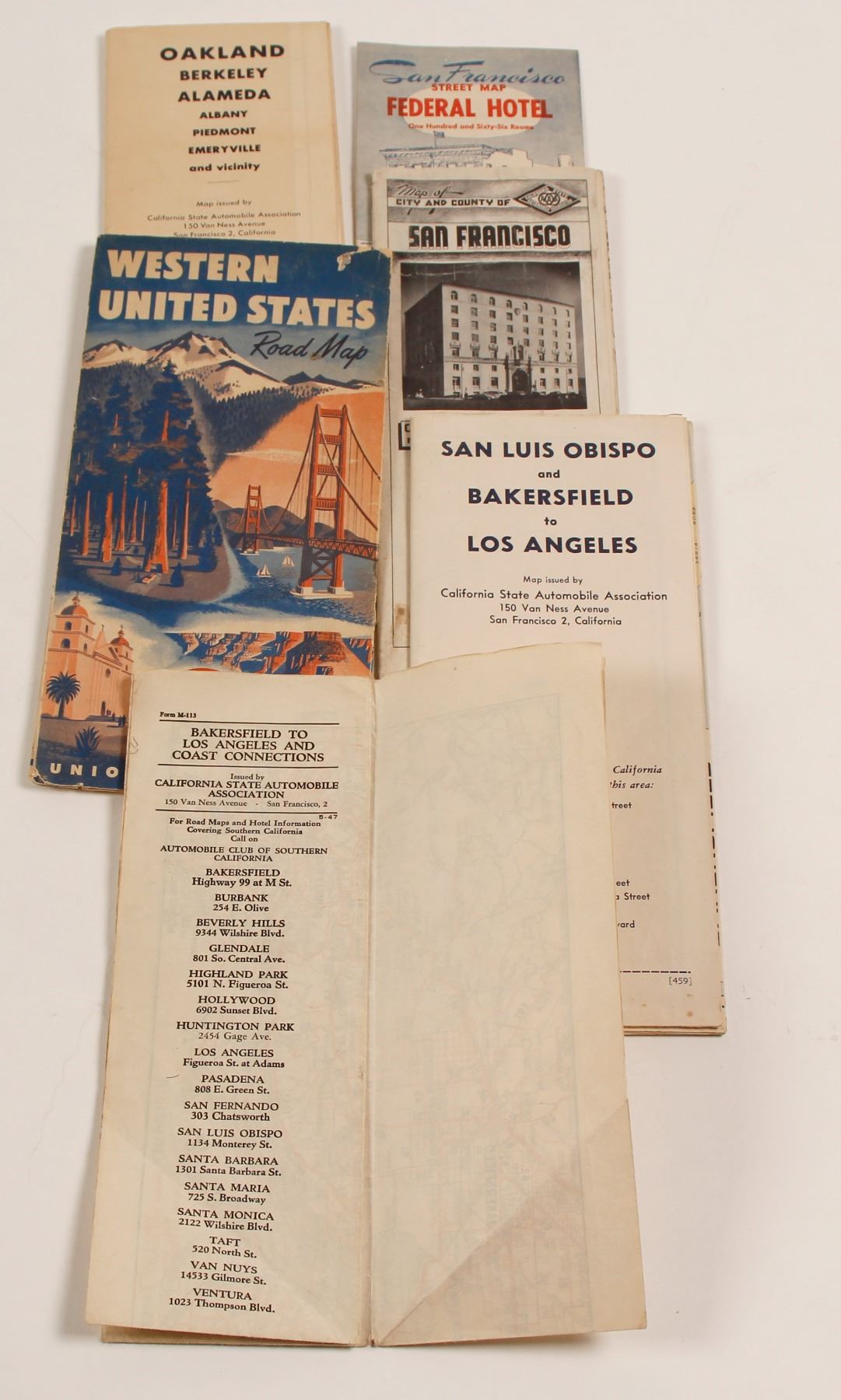 1) San Luis Obispo and Bakersfield to Los Angeles, issued by Calif. State Automobile Assoc(2 versions) 2) City and County of San Francisco issued by Calif. State Automobile Assoc. 3)San Francisco street map by Federal Hotel 4)Oakland, Berkeley, Alameda, Albany, Piedmont, Emeryville and vicinity issued by Calif. State Automobile Assoc 5)Western United States by Union 76