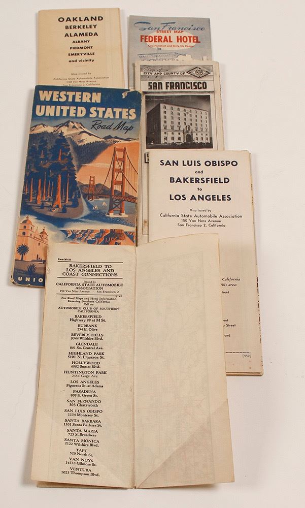 1) San Luis Obispo and Bakersfield to Los Angeles, issued by Calif. State Automobile Assoc(2 versions) 2) City and County of San Francisco issued by Calif. State Automobile Assoc. 3)San Francisco street map by Federal Hotel 4)Oakland, Berkeley, Alameda, Albany, Piedmont, Emeryville and vicinity issued by Calif. State Automobile Assoc 5)Western United States by Union 76 Date: Location: California HWAC# 56533