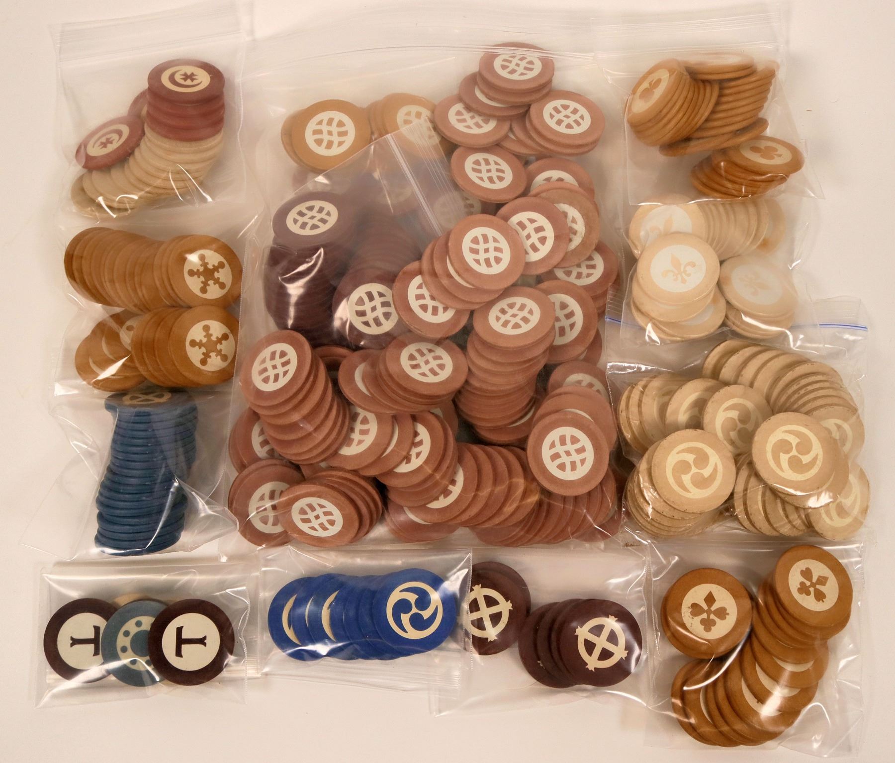 109 Abstract circle design, pink and white; 25 Yellow club; 21 Fleur de Lis; 20 steering Wheel; 17 heart-diamond-spade-club; 7 blue commas, 37 white commas; 19 Blue circle w' cross, 6 maroon circle w/ cross; 10 white moon w/ Maltese cross, 6 maroon circle w/ Maltese cross; 6 Misc.