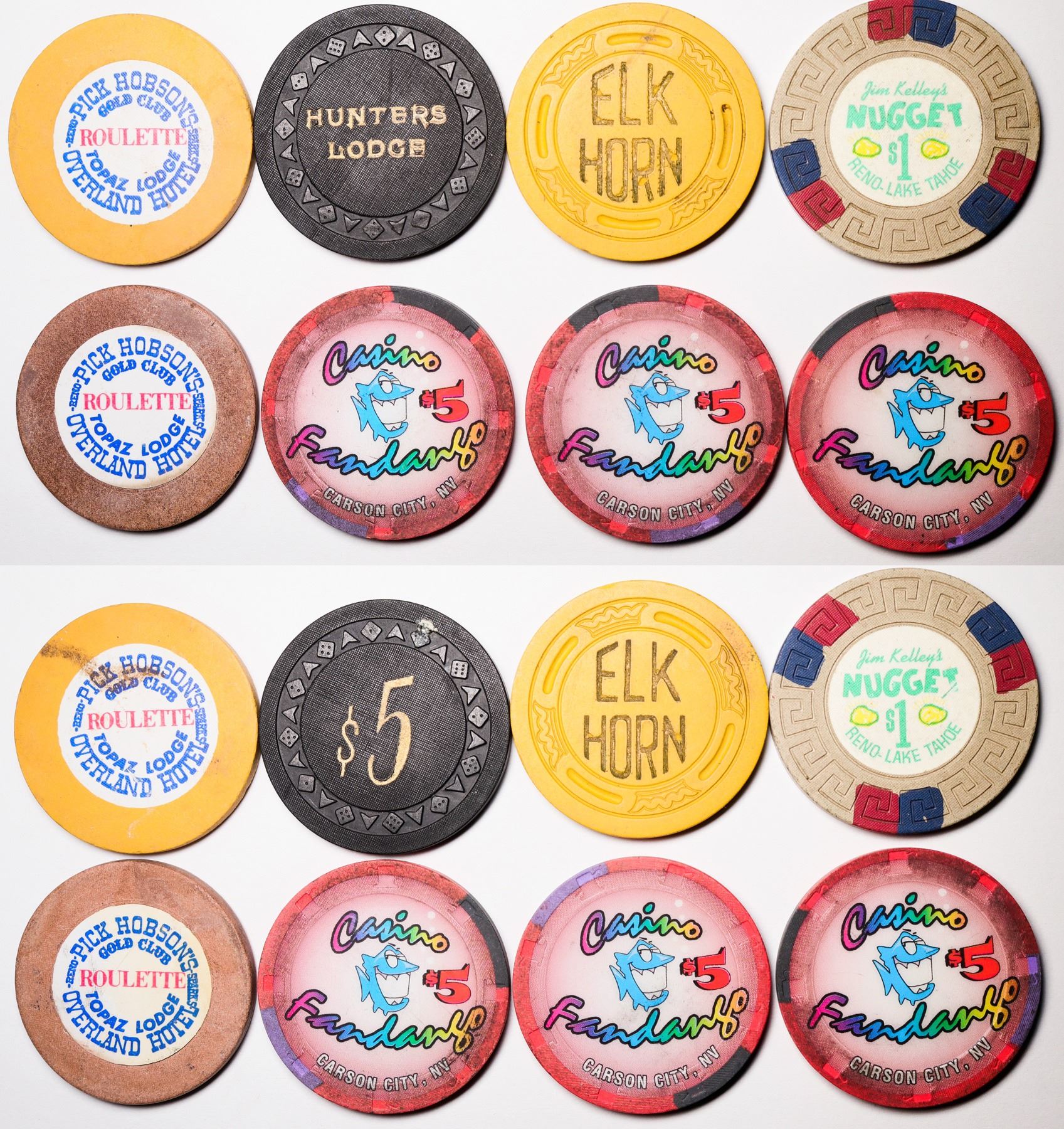 2- Pick Hobson's Overland Hotel, Topaz Lodge; 3 Casino Fandango, Carson City; 1 Jim Kelley's Nugget, Reno-Lake Tahoe; 1 Elk Horn; 1 Hunters Lodge, Carson City--Rare