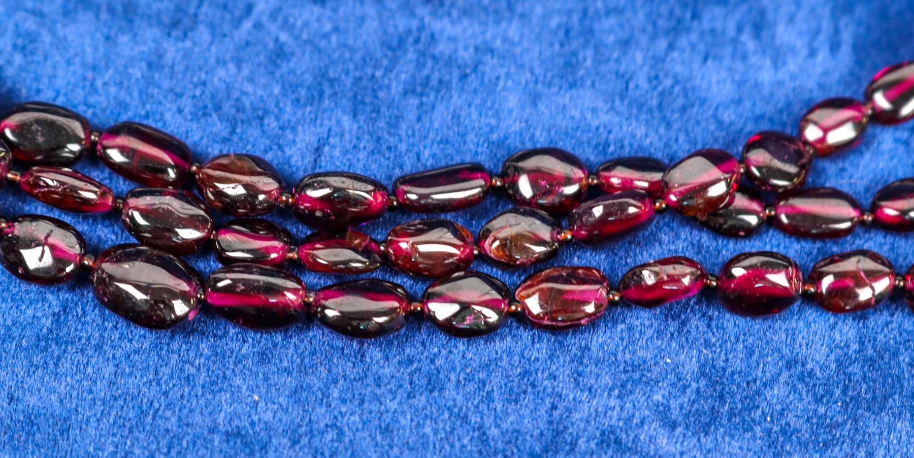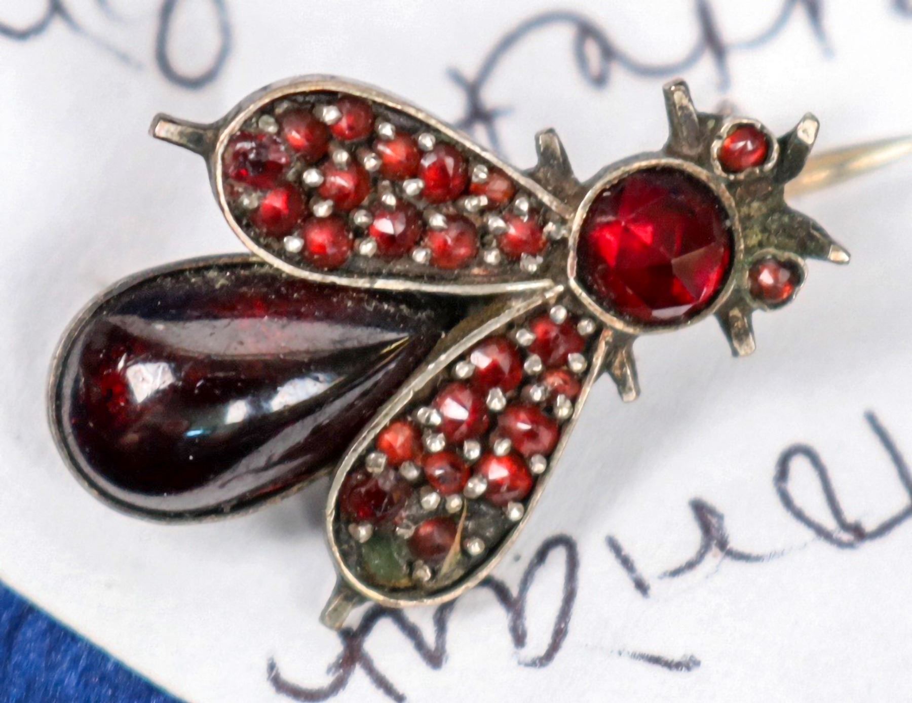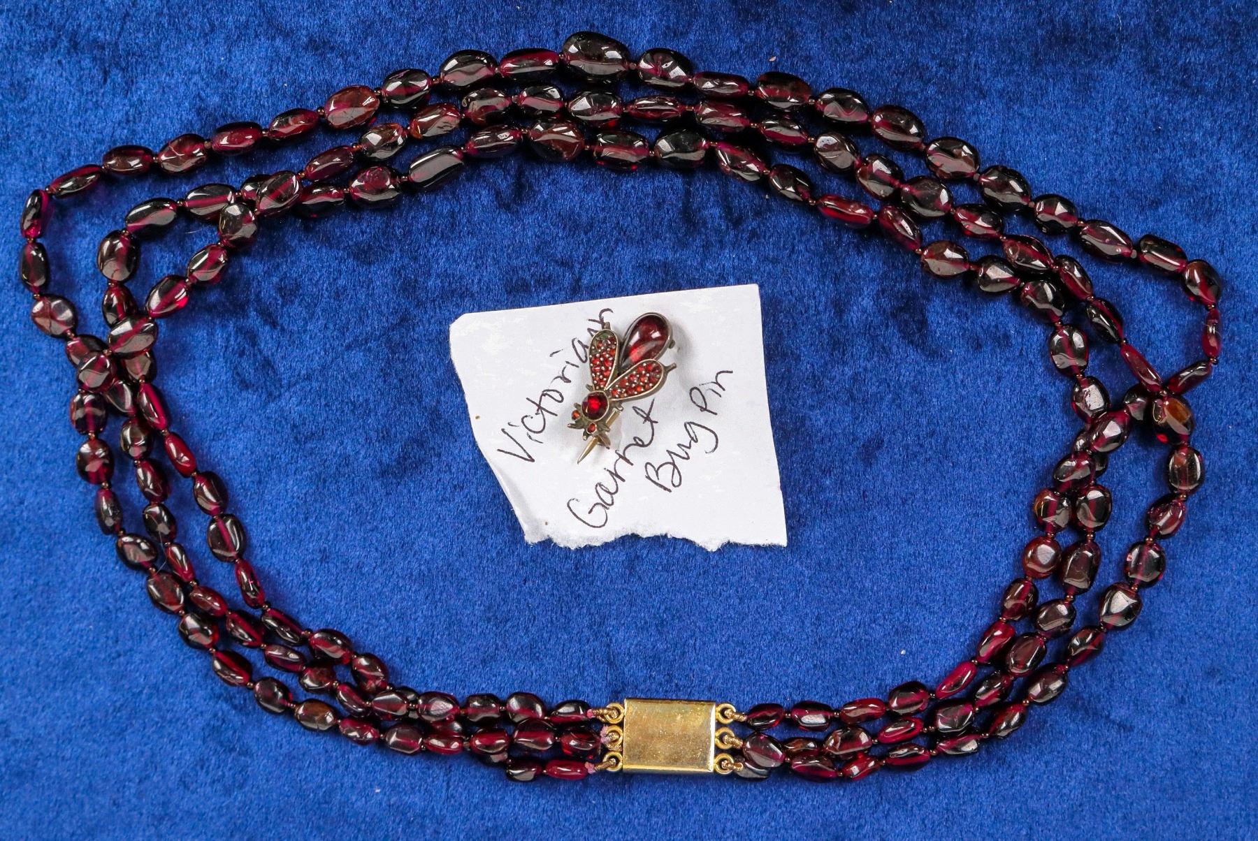 Victorian Bohemian garnet bug brooch. Vintage 3-strand garnet oval bead necklace--shortest strand--15". Exquisite pieces.