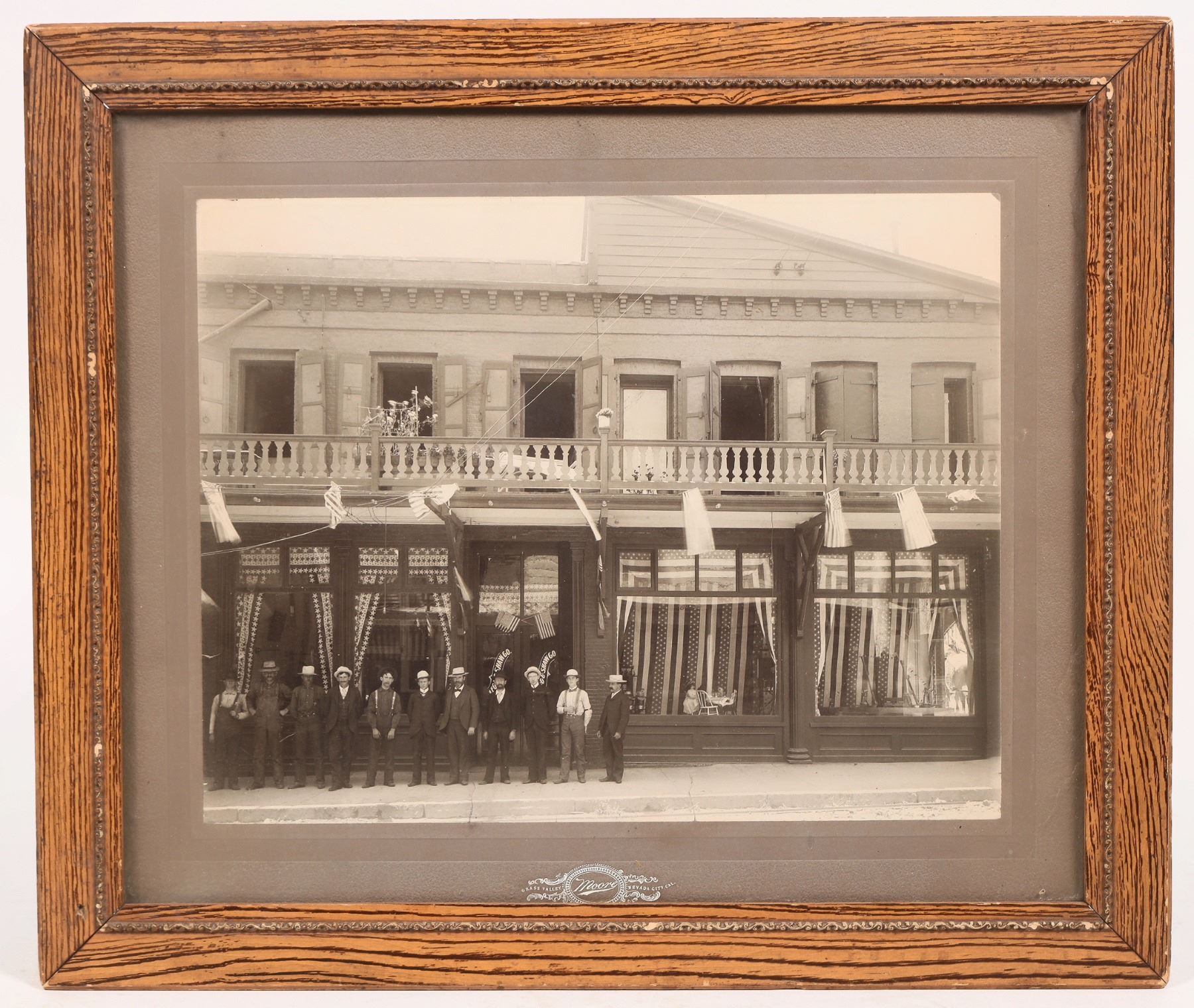 A vintage photograph taken by Moore Photography of Grass Valley/ Nevada City. It shows a group of men posing in front of a building, with the name Shaw on the window. Framed (19 x 16 inches) and ready to hang. Please see photos for more details._x000D_