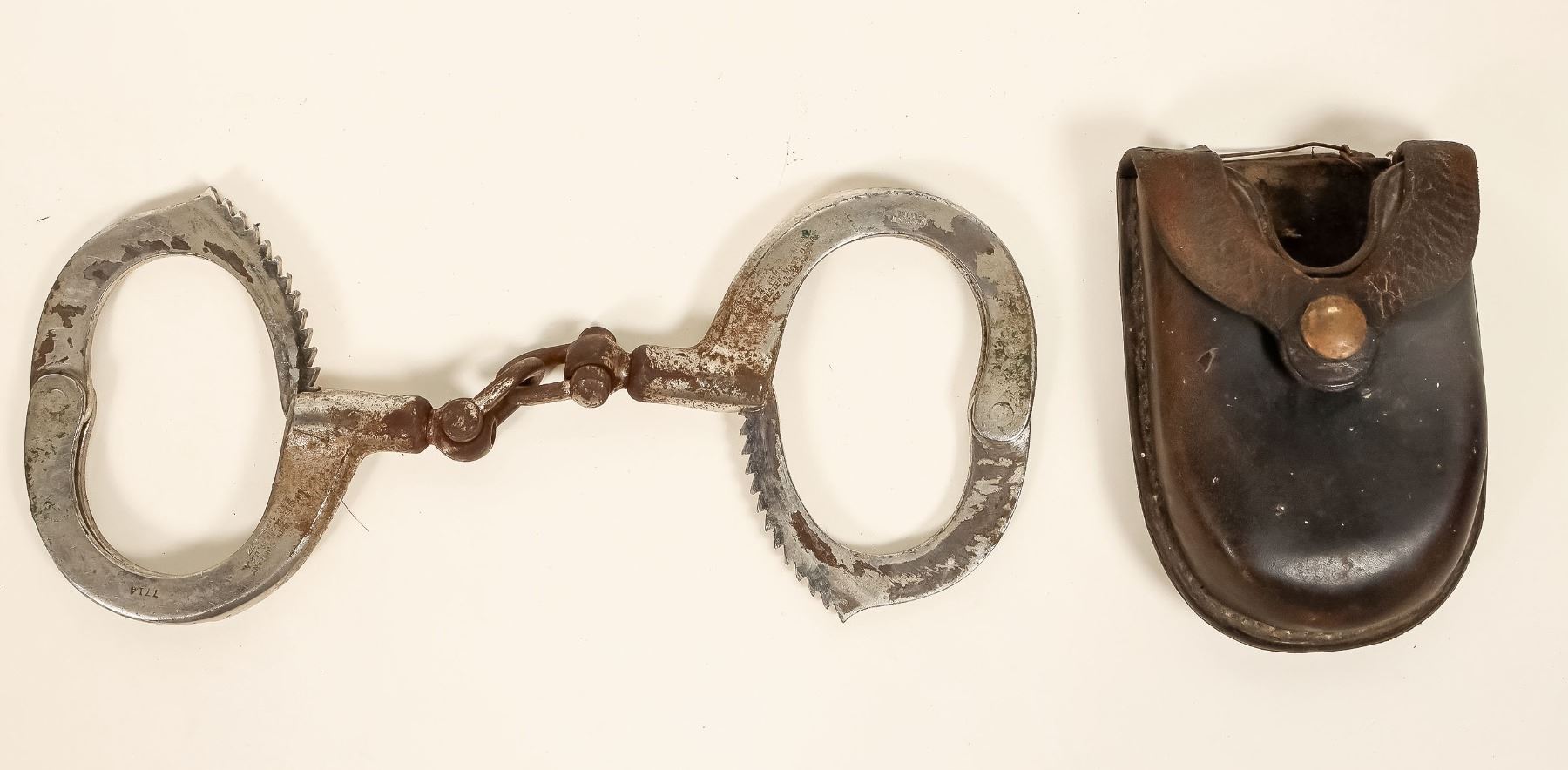 H&R handcuffs. These are keyless and have a serial number #7714 and a little bit of age rust. These come with a leather carrying case that hooks to the belt. Again, clean off a bit of rust and these will make a great collector's item. Please see photos for more details.