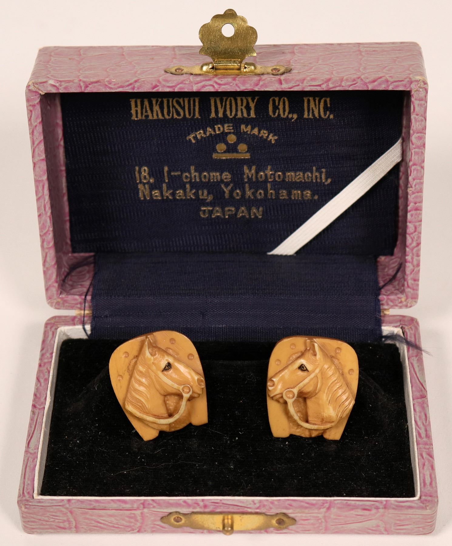 Vintage Hakusui ivory, horse head cuff-links. Post is inscribed 'silver.' Box shows wear on bottom, and rounded corners.