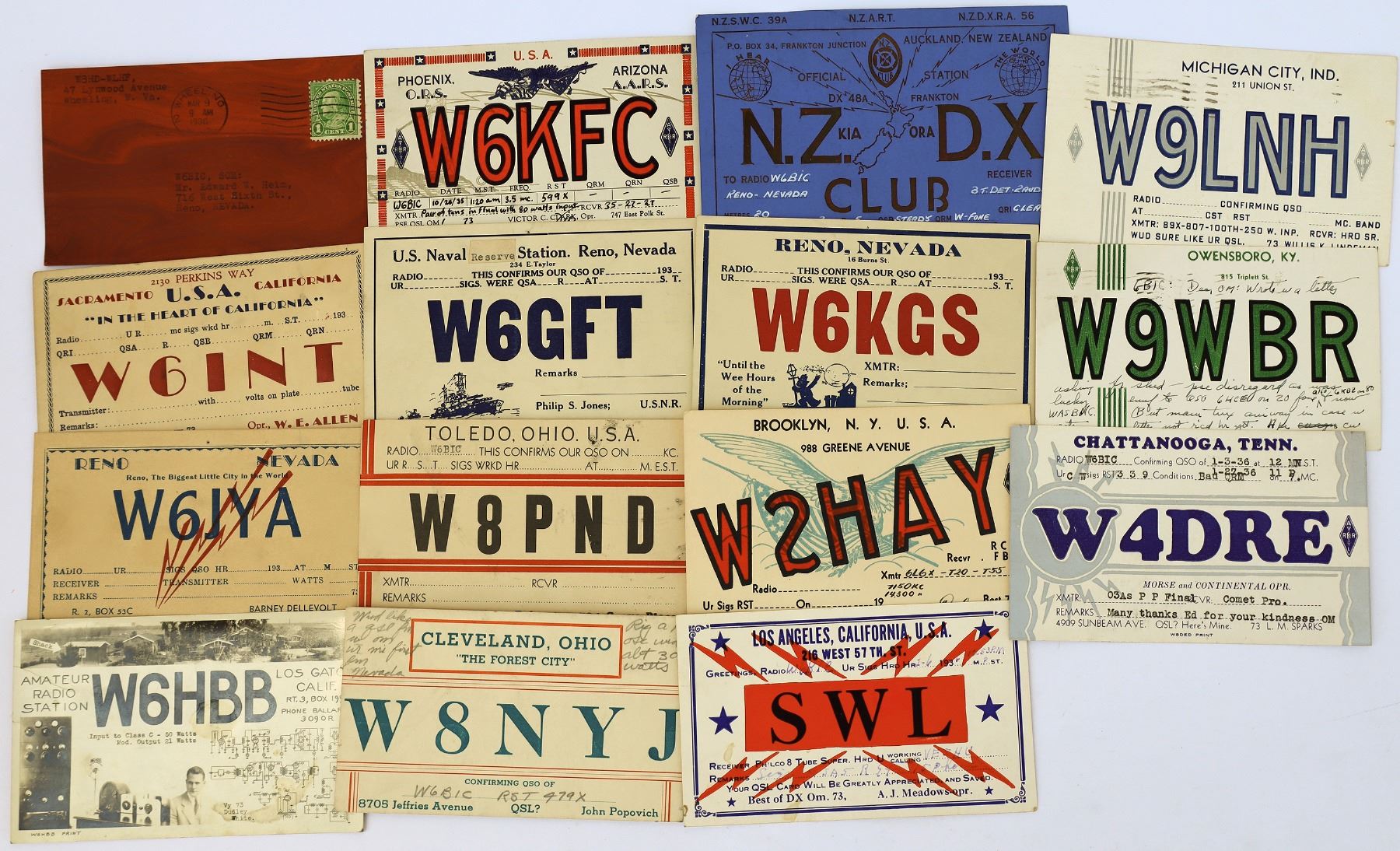15 vintage ham radio QSO cards from c. 1936. 1 on red wood like paper. 1 RPC with gear.