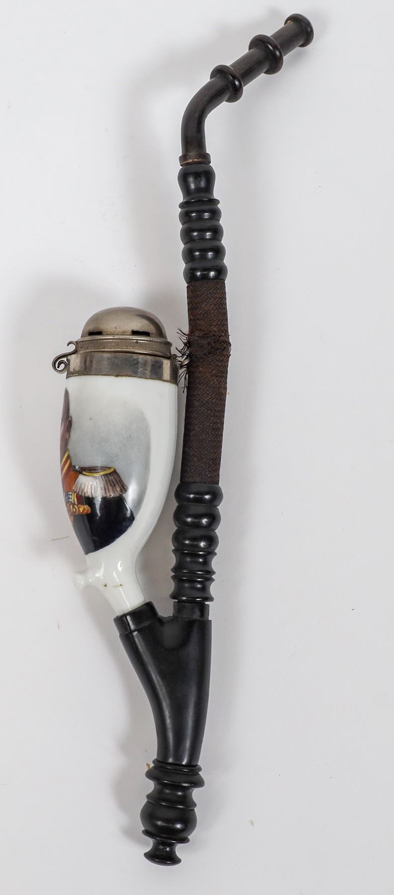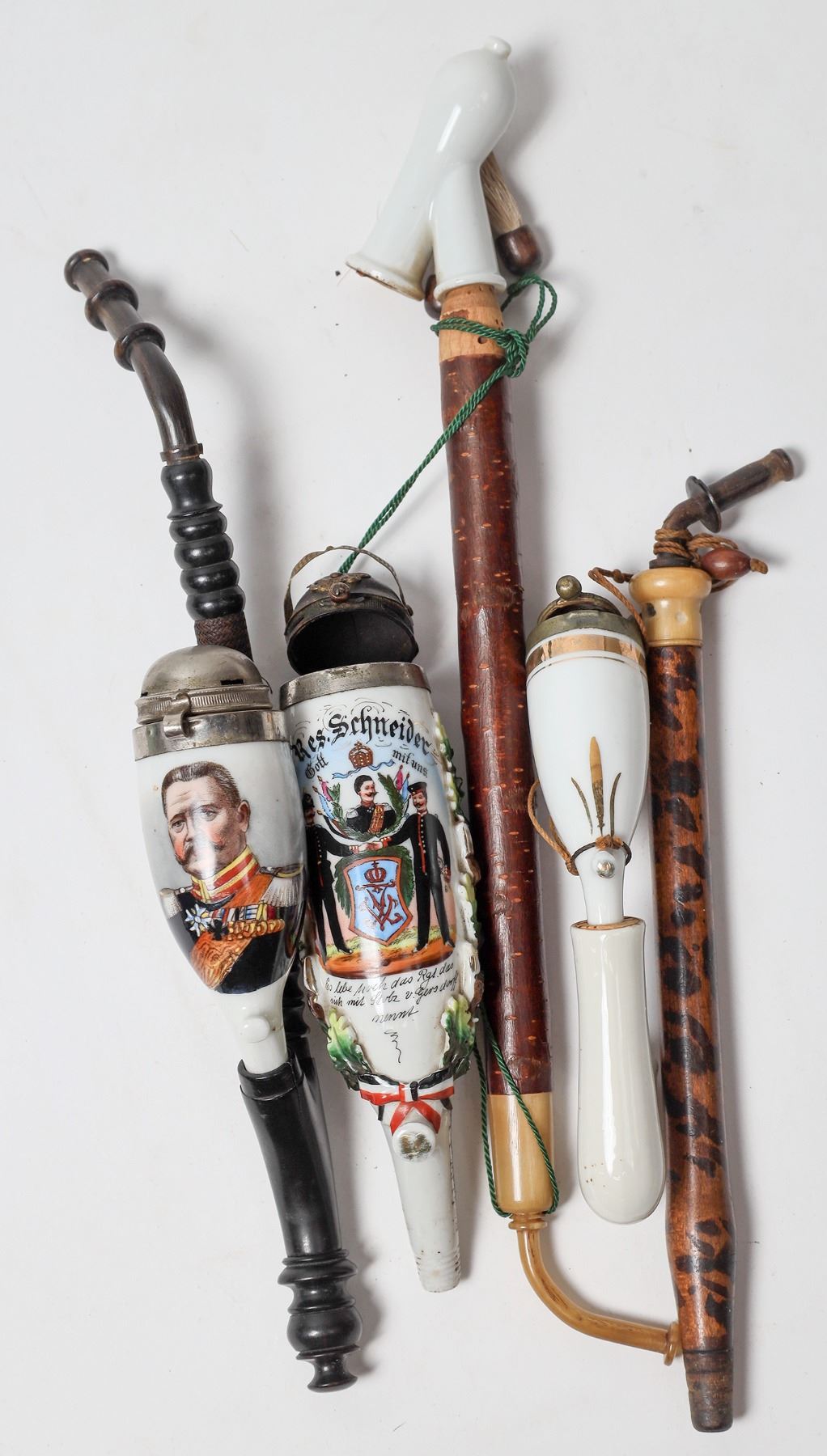 3 different vintage hand carved German regimental pipes. Res. Schneider c. 1904. Pictorial Generaloberst von Hindenburg. Unmarked white with gold trim.