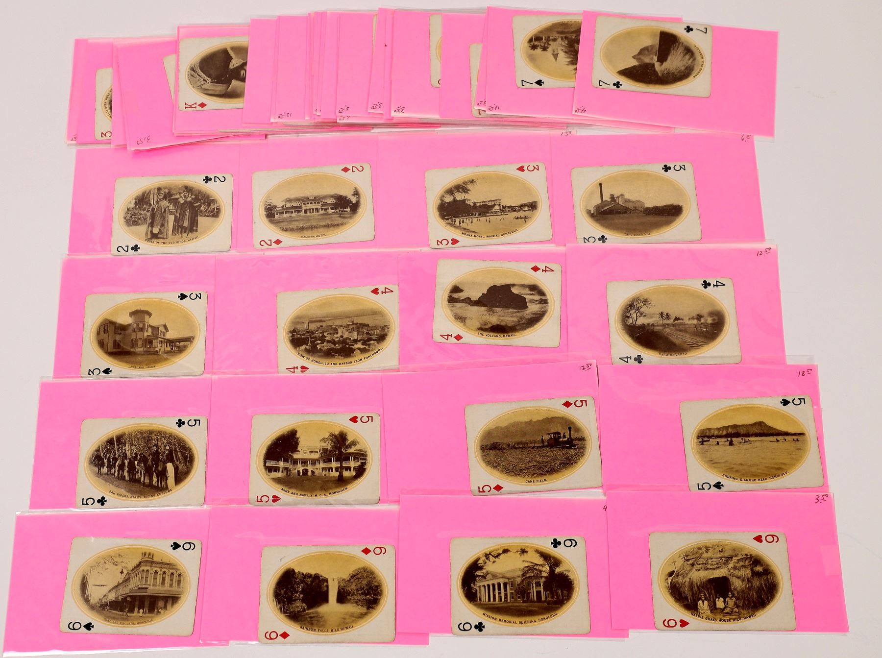 Lot of 48 different. Not a complete set. Missing: 10 diamonds, J diamonds and spades, and Q diamonds. Reverse features King Kamehameha Statue. Obverses all different, various tourist locations. No publisher noted.