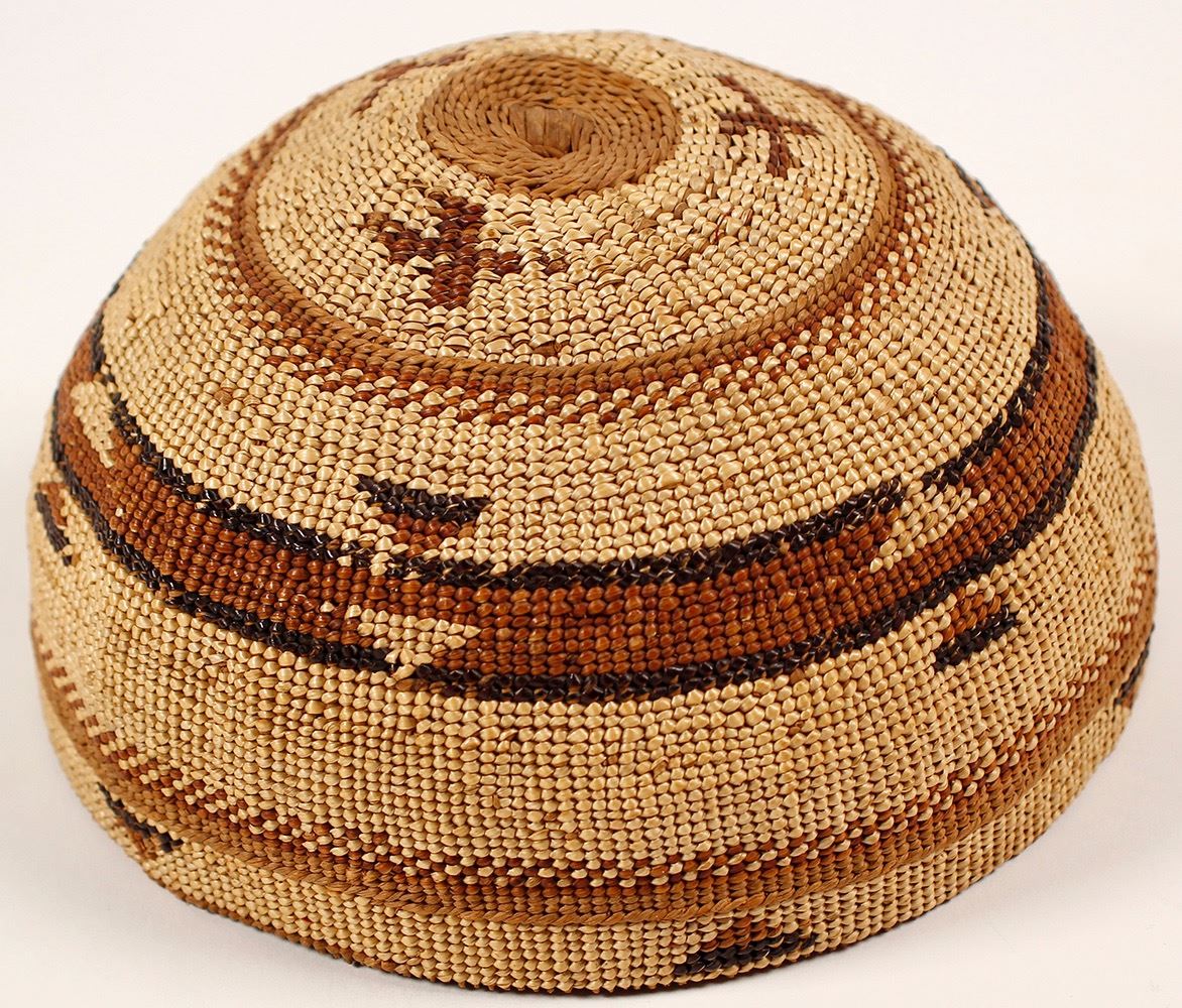 Beautiful antique ceremonial Indian basket hat. y3.5" h x 6" diameter, excellent condition. Bands, triangle and cross designs. HWAC# 58871 Date: c. 1940's Location: California
