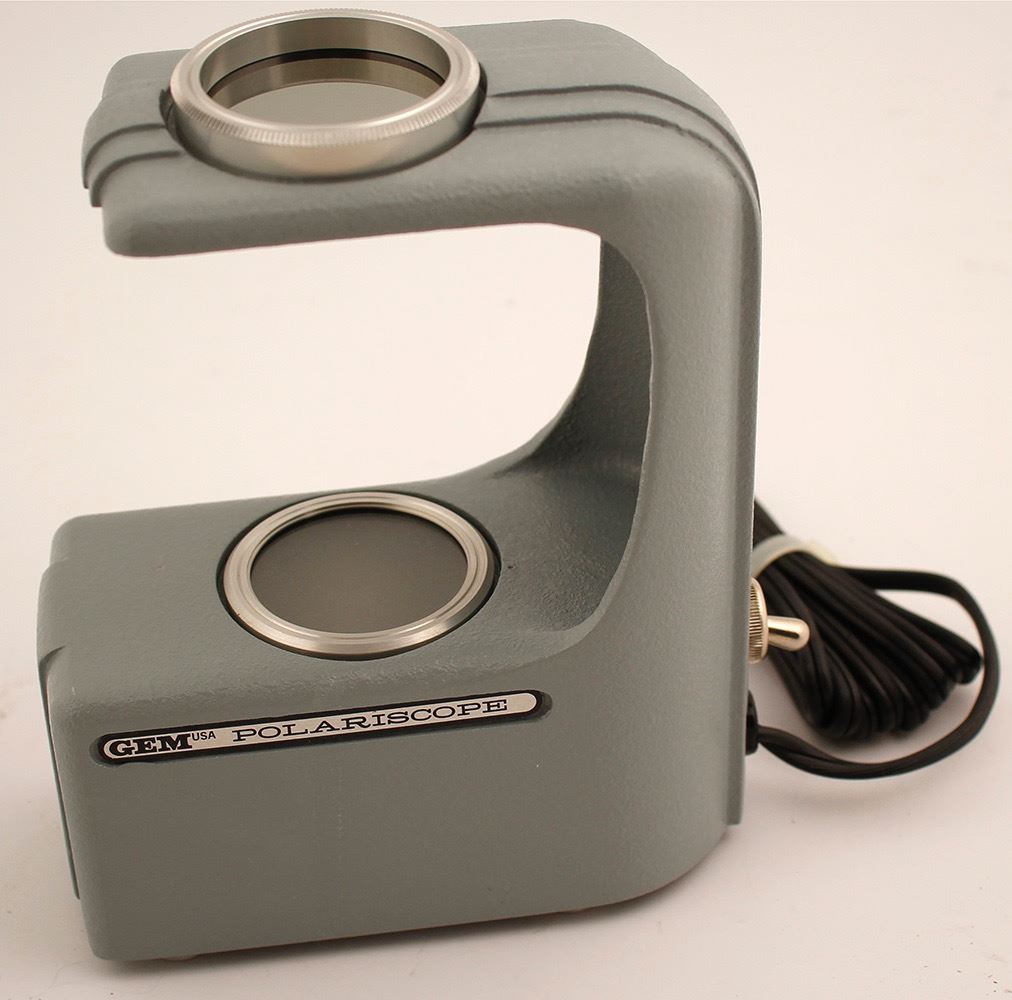 Vintage 1st model of the Illuminator Polariscope from the Geological Institute of America. Complete in original box, with pamphlet and dust cover. Excellent condition. A polariscope is one of the most important tools for a gemologist. Also known as a polarimeter, this device can show the optic character of a gemstone and determine whether it is isotropic or anisotropic. This information can help scientists or gem hobbyists identify the gemstone or mineral. HWAC# 61529 Date: Location: New York