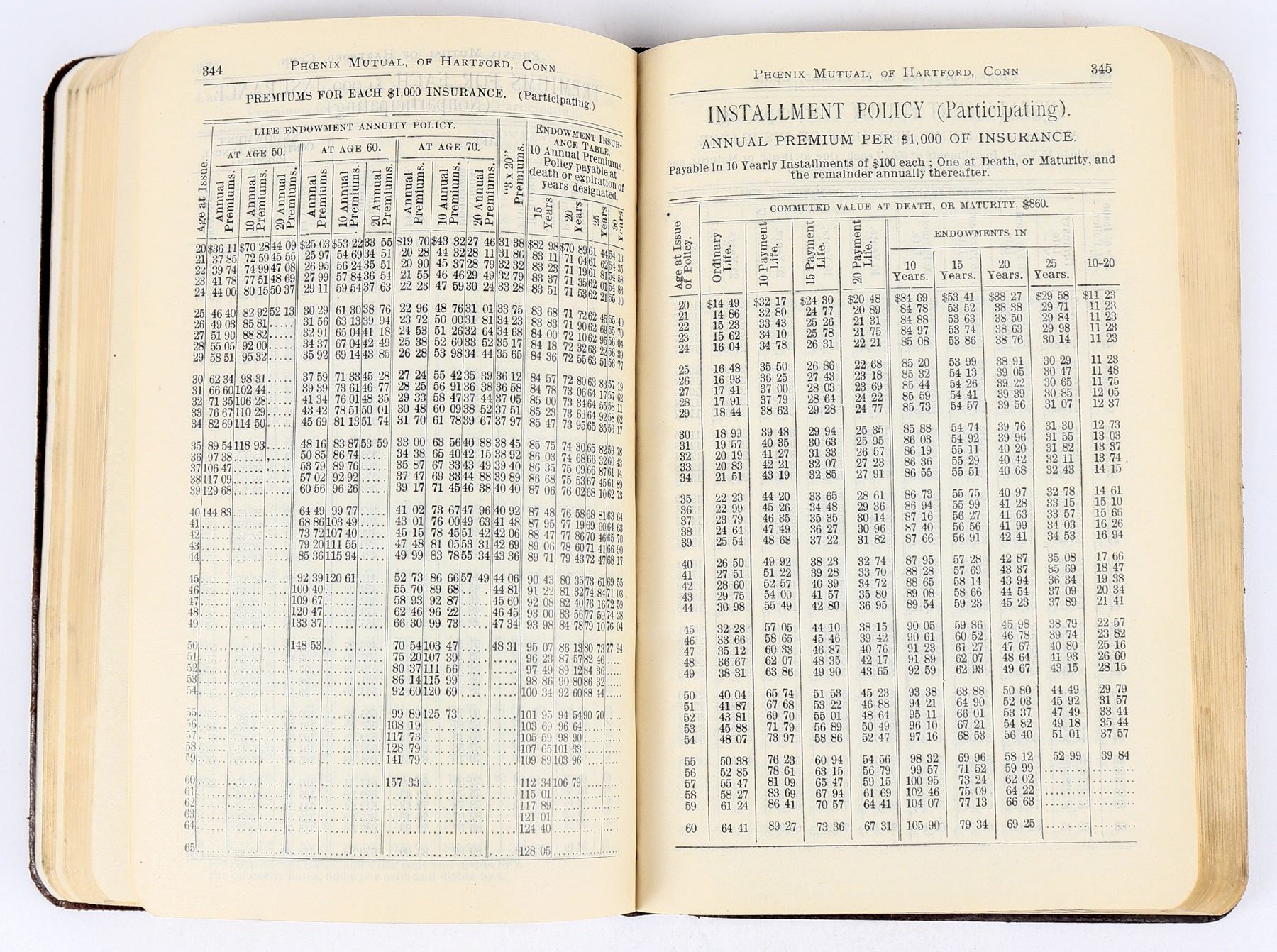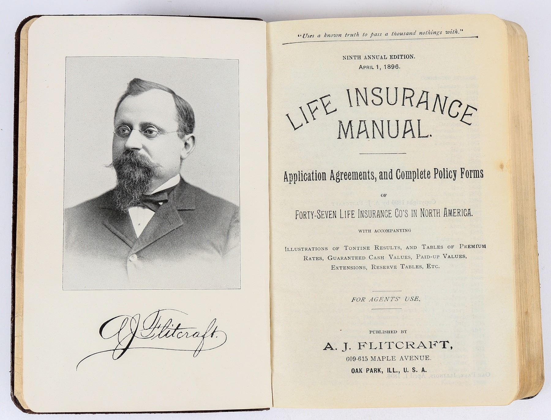 1896 insurance agent guide published by AJ Flitcraft for 57 life insurance companies. Many tables of cash value, paid up insurance, premium etc. 696pp.