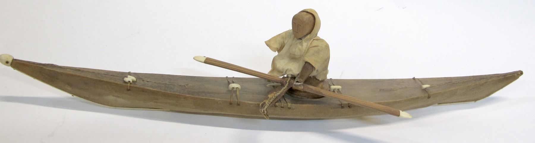 Kayak made of wood with thin sinew covering. Eskimo figure in kayak of wood (one arm missing) with cloth outfit. He holds a paddle of wood with ivory ends. Ivory accents also on kayak. Date: Location: Alaska HWAC # 54872