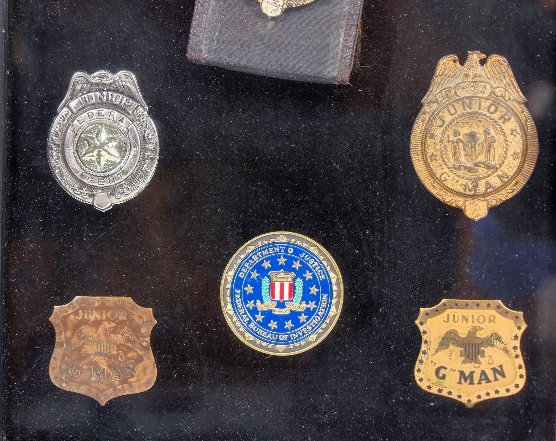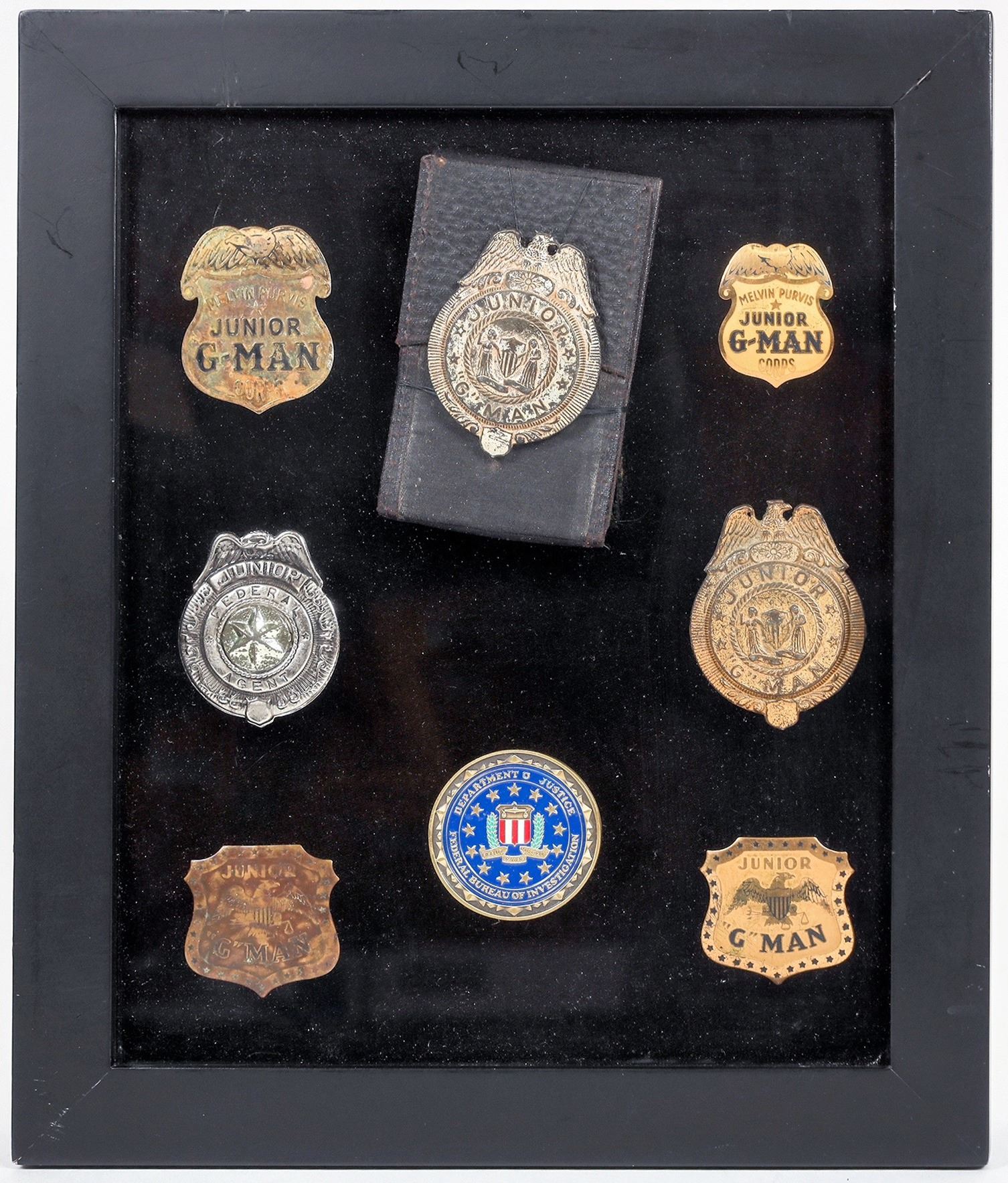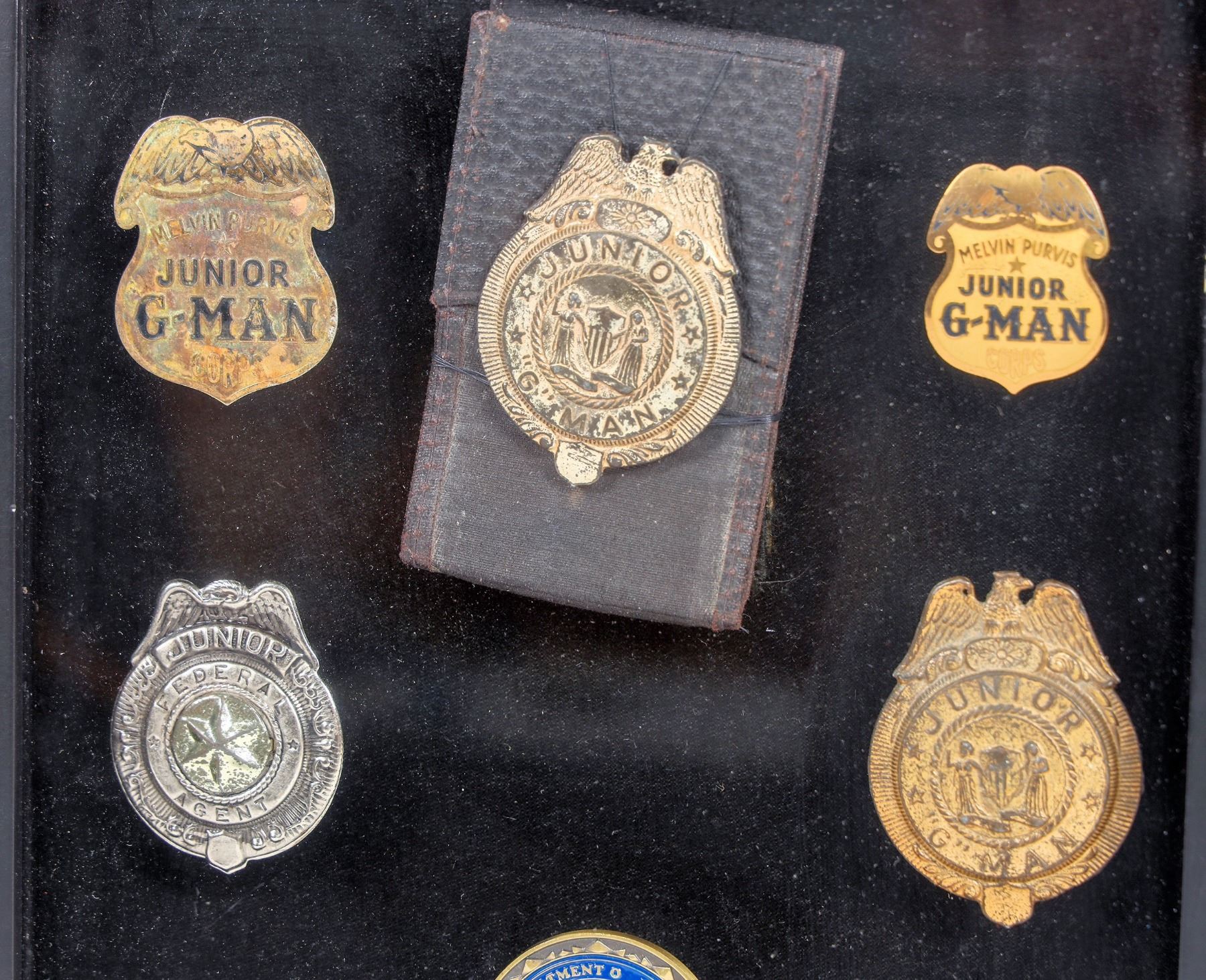 Nicely encased in nice display case for hanging are seven Junior G-man badges and one FBI challenge coin. One badge is displayed with a "wallet". These are in choice vintage condition .Junior G-Man American Boy's club of the 1930'-40' was based on a radio program hosted by Melvin Purvis after he retired from the FBI and later in movies featuring, for those that remember, "The Dead End Kids". Purvis is the agent that led the manhunt for John Dillinger and his eventual death.