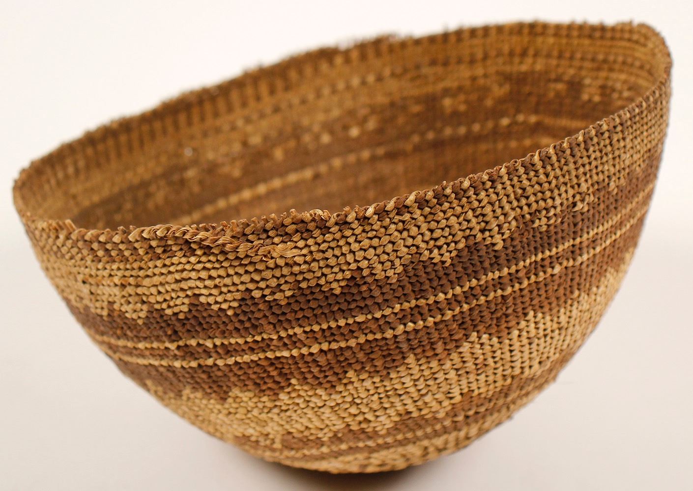 Karuk ceremonial hat basket. Zig zag banded designs. Some rim damage. 4" h x 6.5" diameter, good condition. Robert Fulton Collection. HWAC# 58872 Date: c. 1890's Location: California
