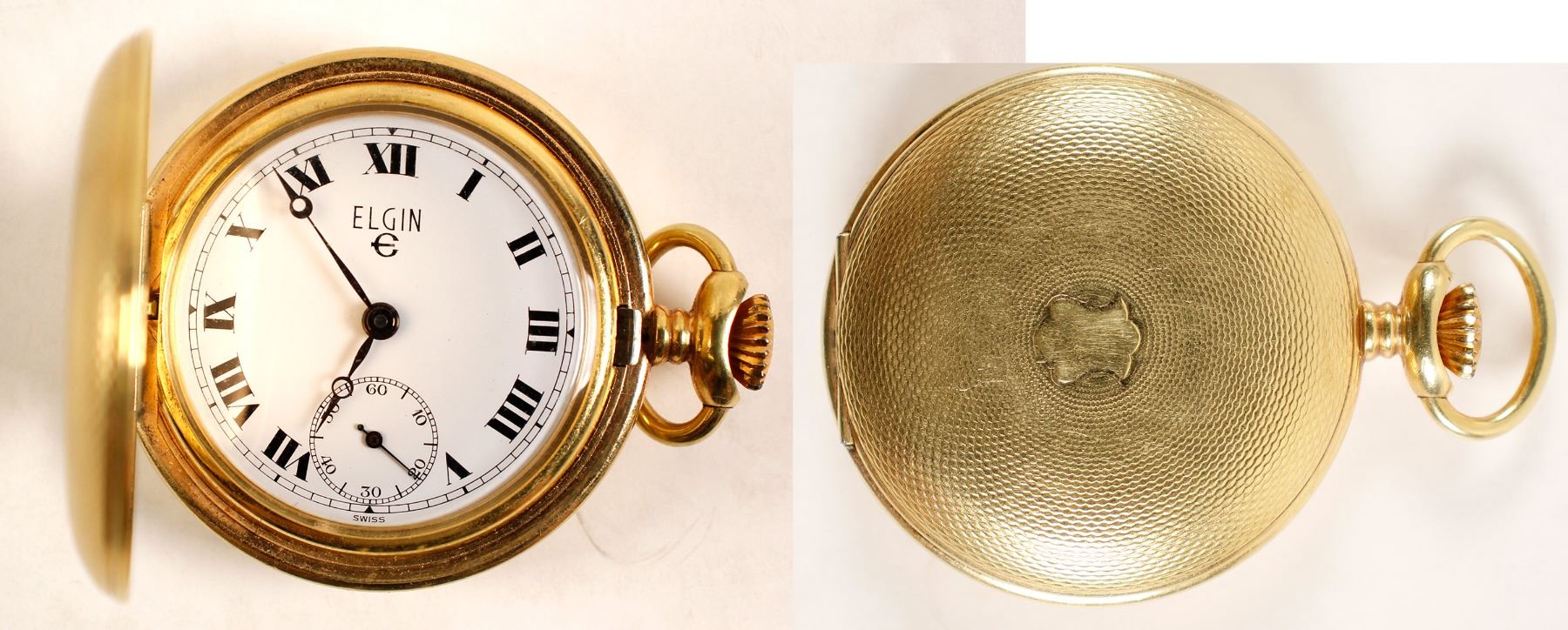 Inside back cover says "Elgin SA / Switzerland / Base Metal / 98222 / Plaque G / 10 Microns". Inside says "Elgin S A / 98 U2", "Unadjusted", "Swiss" and "Seventeen / 17 Jewels".