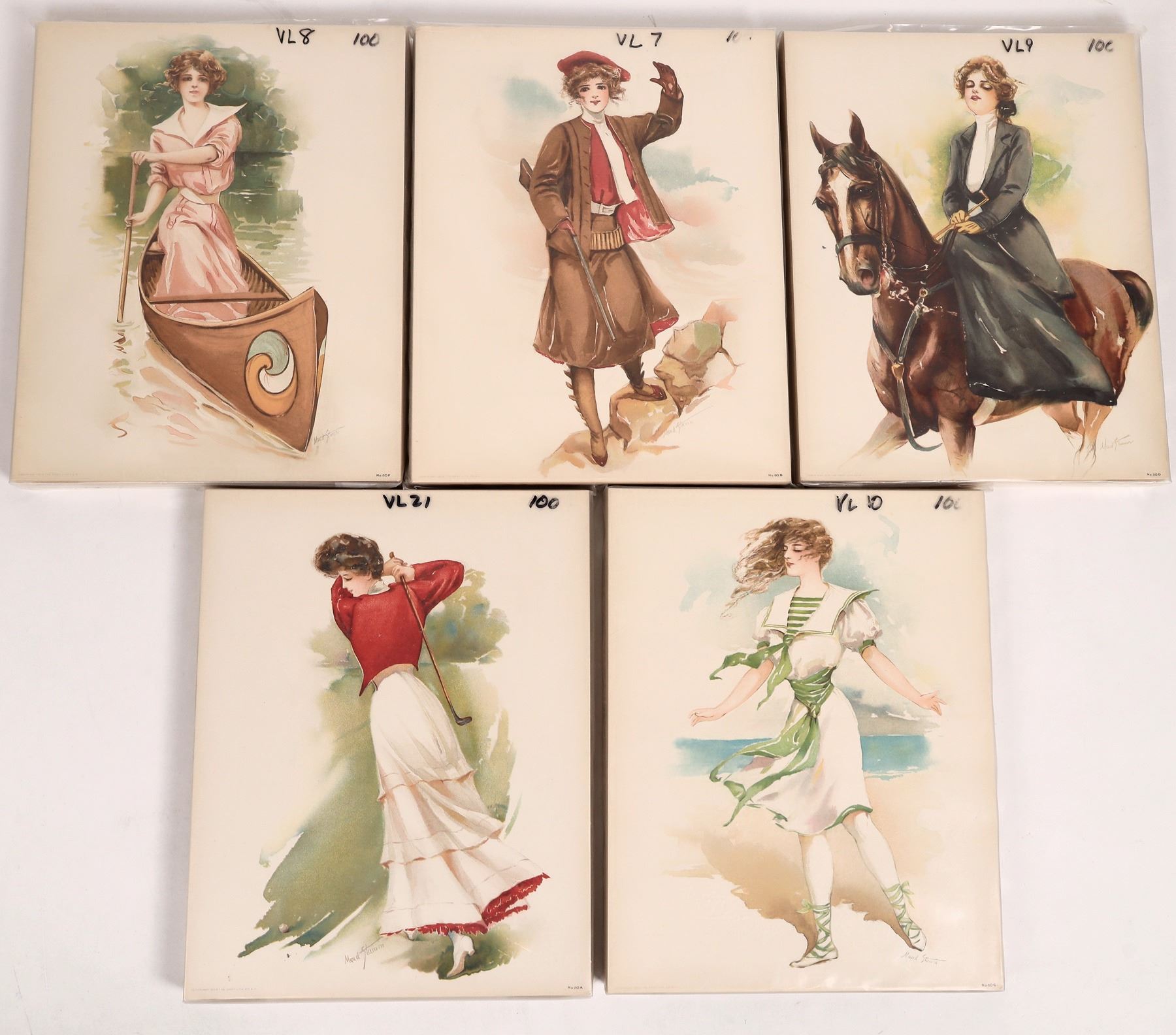 100 each of art prints by Gray Litho, c. 1908. Red golfer, green trim, canoe, horse, hunter. 12.5x10". 19 lbs.