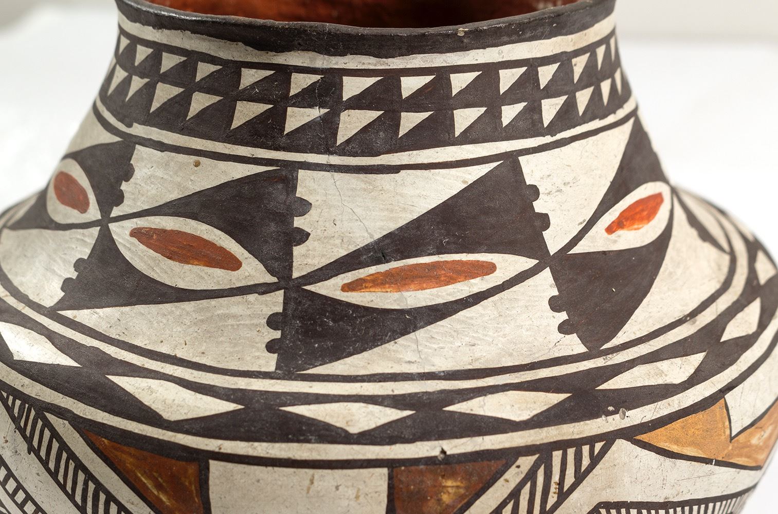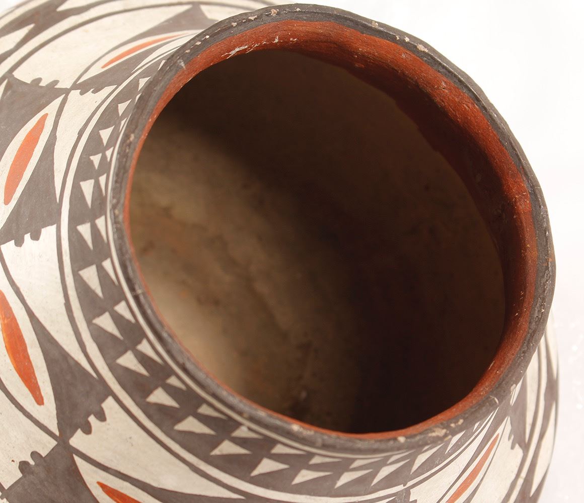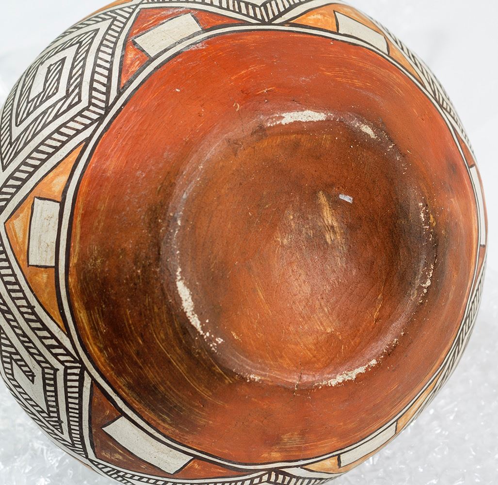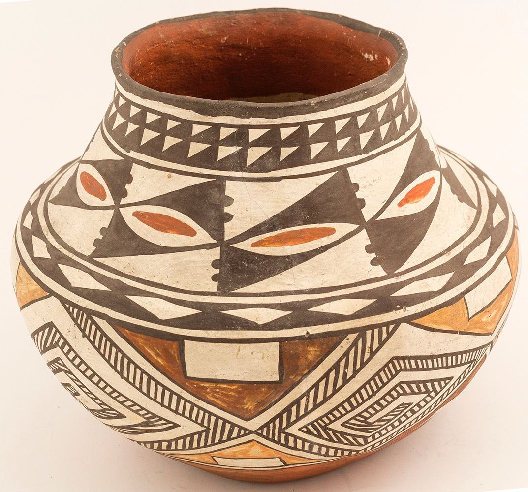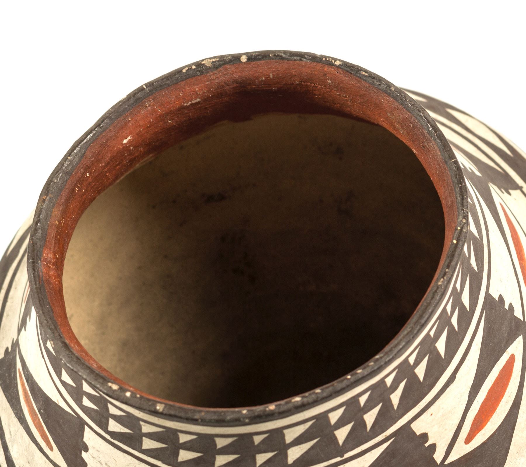 Vintage Laguna jar, 7" h x 8.5" diameter. A fabulous circa 19th century pottery vase/bowl with traditional red, black and white geometric designs. No signature present. In great condition for its age, slight rubs/wear/crazing to paint, tiny cracks visible. Date: c.1900 Location: Laguna Pueblo, New Mexico HWAC # 49328