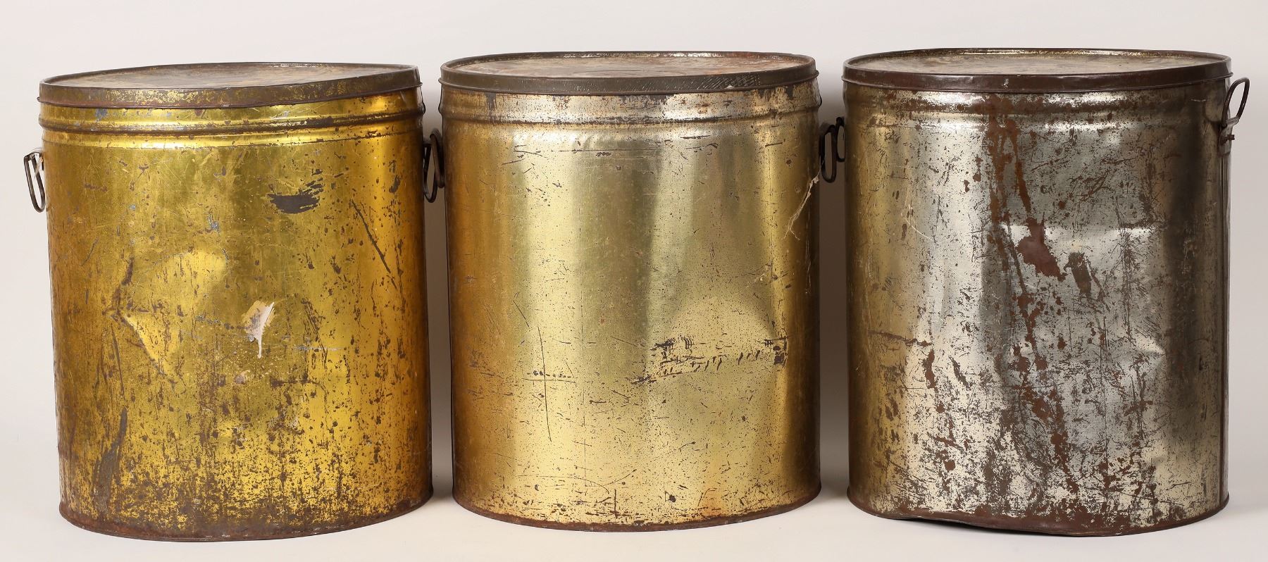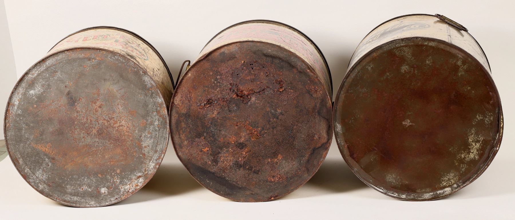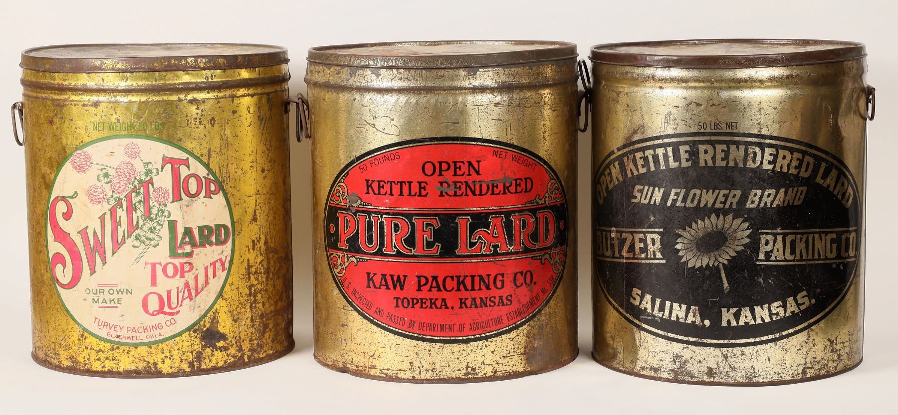 Three (3) large 50 pound canisters that once held lard. The brands are Sun Flower of Salina, Kansas, Kaw Packing Company of Topeka, Kansas and Sweet Top of Blackwell, Oklahoma. These canisters measure 12"x 14" and have wear, but are still attractive and a sign of the early times. Please see photos for more details. Kansas Gary Bracken Collection