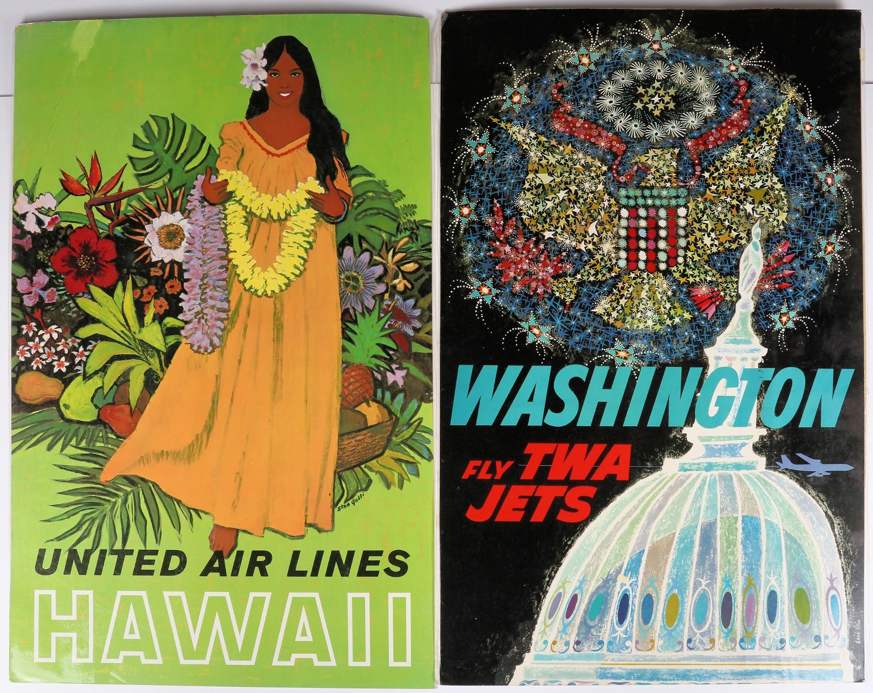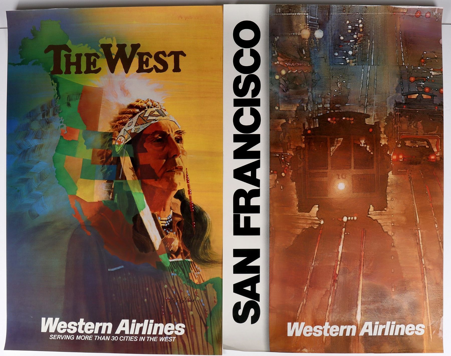 16 vintage airline travel poster, c. 1960's to 70's. All but 1 are laminated. About 37x24". The West, Western Airlines. San Francisco, Western Airlines. London TWA. Air Cargo TWA 3 corners have damage. Ketchikan, Alaska Airlines. Marseille. Switzerland, TWA. Philadelphia, TWA, right side chips. Paris and Nice, bottom .5" tear. Pacific Northwest, United Airlines, creases. Lighthouse, United Airlines. Tunise, Washington, TWA. Hawaii, United Airlines. Bermuda, Pan Am, right side damage and creases. San Francisco, United Airlines. Nice display group!