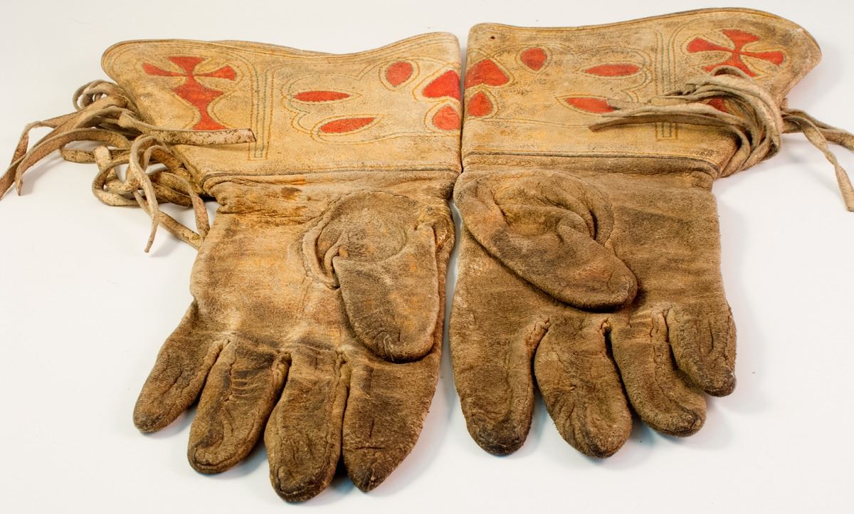 Vintage leather gauntlets with dyed red design on cuffs, red and green stitching, fringe on side. Well worn. State: City: Date: 1922 FHWAC#: 42036